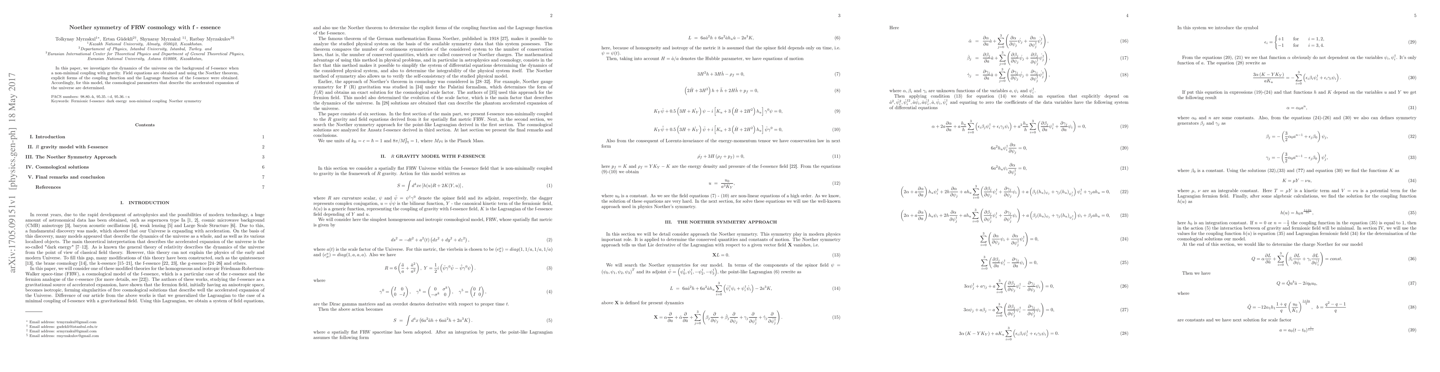 In this paper, we investigate the dynamics of the universe on the background of f-essence when a non-minimal coupling with gravity. Field equations are obtained and using the Noether theorem, explicit forms of the coupling function and the Lagrange function of the f-essence were obtained. Accordingly, for this model, the cosmological parameters that describe the accelerated expansion of the universe are determined.