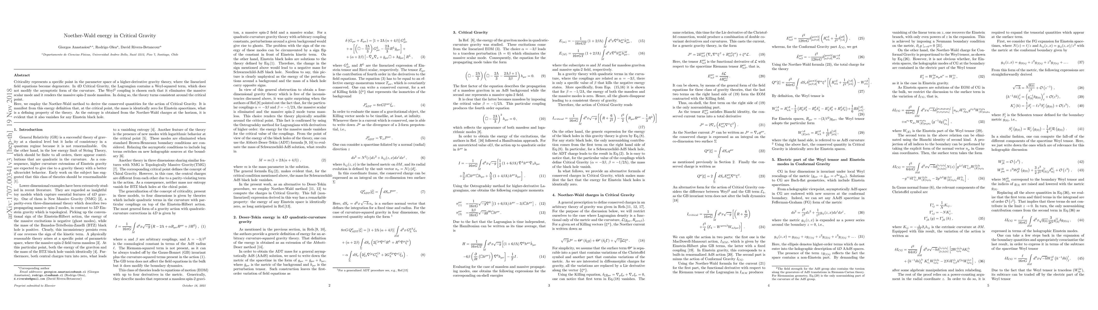 Criticality represents a specific point in the parameter space of a higher-derivative gravity theory, where the linearized field equations become degenerate. In 4D Critical Gravity, the Lagrangian contains a Weyl-squared term, which does not modify the asymptotic form of the curvature. The Weyl$^{2}$ coupling is chosen such that it eliminates the massive scalar mode and it renders the massive spin-2 mode massless. In doing so, the theory turns consistent around the critical point. Here, we employ the Noether-Wald method to derive the conserved quantities for the action of Critical Gravity. It is manifest from this energy definition that, at the critical point, the mass is identically zero for Einstein spacetimes, what is a defining property of the theory. As the entropy is obtained from the Noether-Wald charges at the horizon, it is evident that it also vanishes for any Einstein black hole.