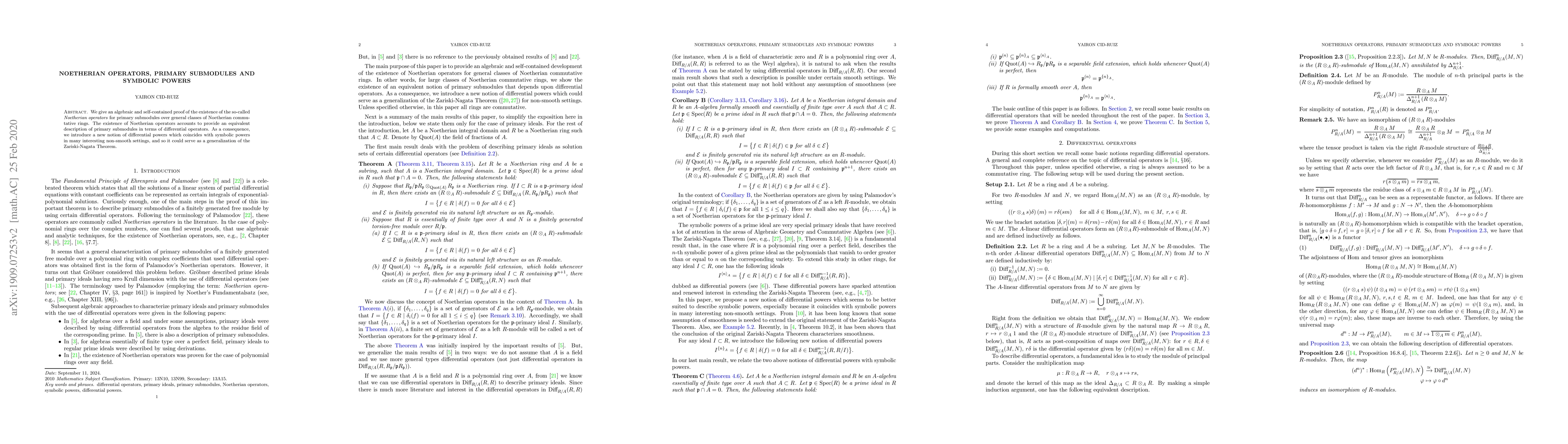 This paper provides an algebraic proof for the existence of Noetherian operators for primary submodules over general Noetherian commutative rings, offering an alternative description via differential operators. It also introduces a new concept of differential powers, which generalizes symbolic powers and extends the Zariski-Nagata Theorem.