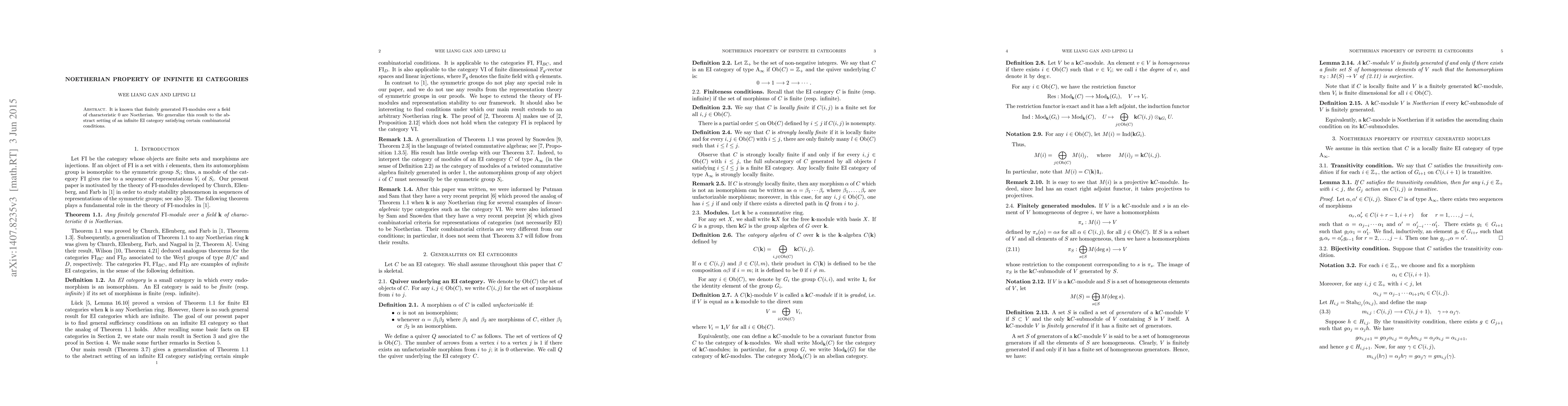 It is known that finitely generated FI-modules over a field of characteristic 0 are Noetherian. We generalize this result to the abstract setting of an infinite EI category satisfying certain combinatorial conditions.