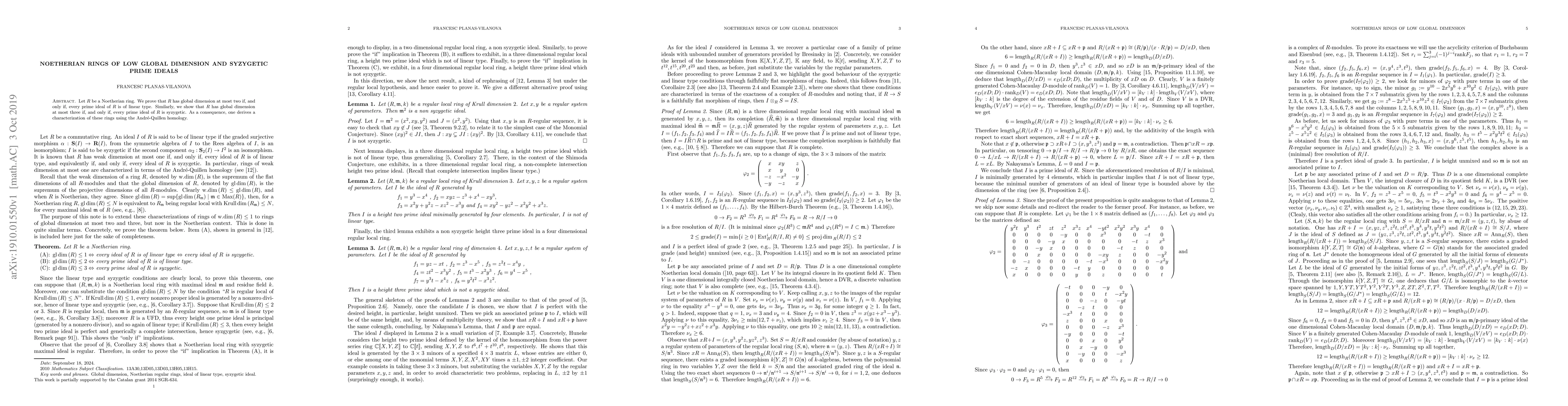 This paper establishes that a Noetherian ring $R$ has a global dimension of at most two if and only if all prime ideals in $R$ are of linear type, and at most three if all are syzygetic, using results from Andr\'e-Quillen homology.