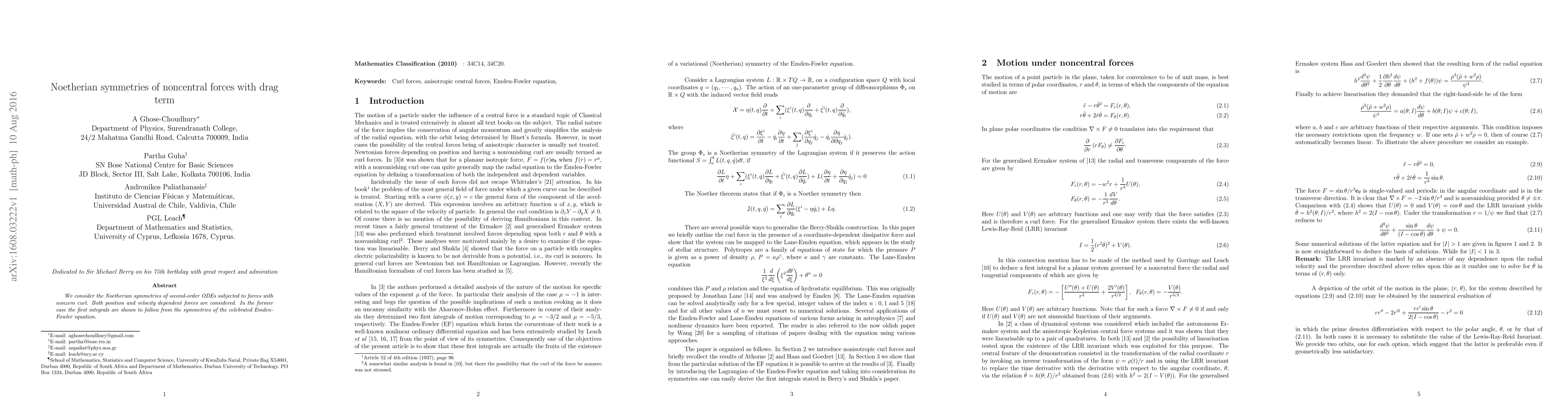 Researchers explored symmetries in ODEs with non-zero curl forces, finding first integrals for Emden-Fowler equation, and shedding light on potential drag term effects.