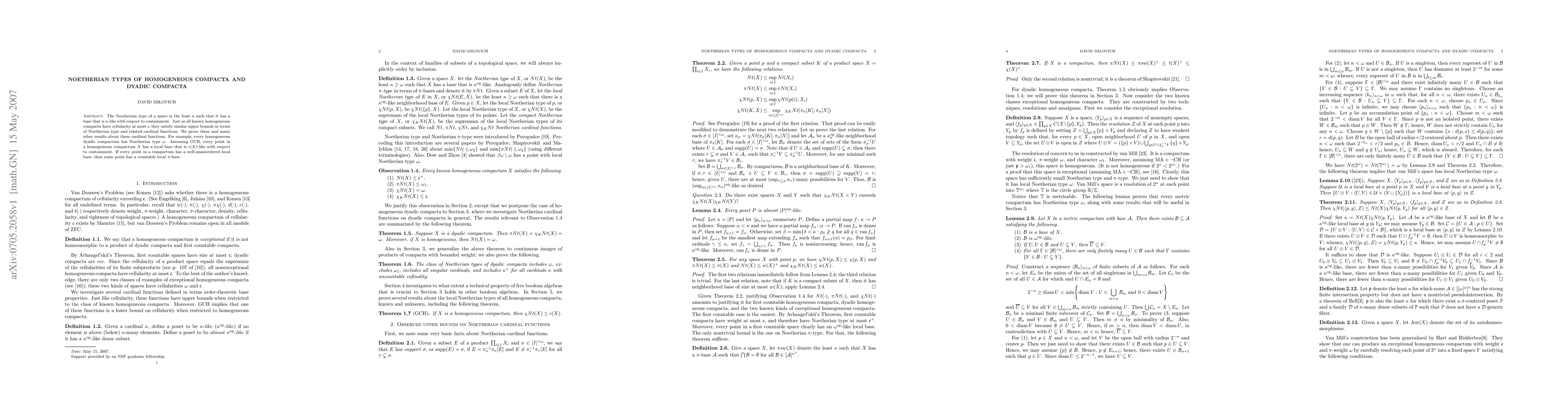 This paper investigates the Noetherian type of homogeneous compacta and dyadic compacta, proving that every homogeneous dyadic compactum has a Noetherian type of $\omega$. It also establishes upper bounds for Noetherian type and related cardinal functions for homogeneous compacta, assuming the Generalized Continuum Hypothesis (GCH).