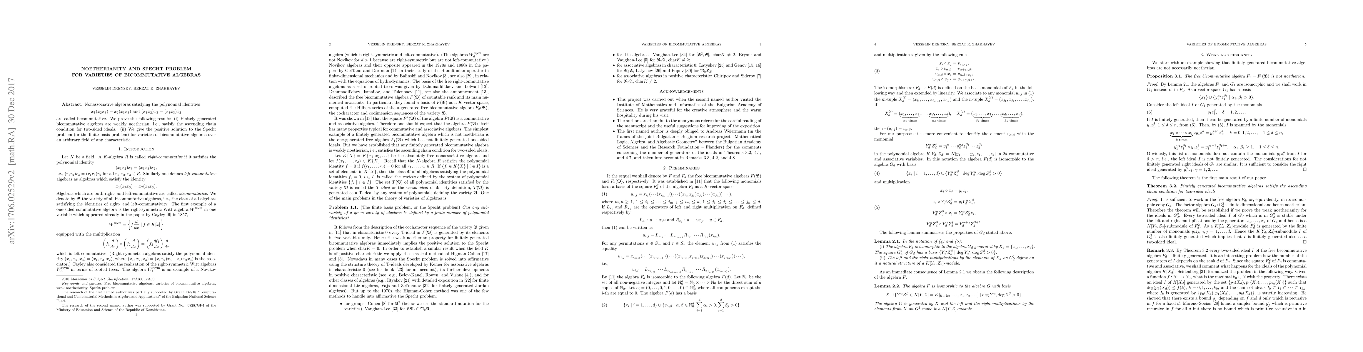 Nonassociative algebras satisfying the polynomial identities x(yz)=y(xz) and (xy)z=(xz)y are called bicommutative. We prove the following results: (i) Finitely generated bicommutative algebras are weakly noetherian, i.e., satisfy the ascending chain condition for two-sided ideals. (ii) We give the positive solution to the Specht problem (or the finite basis problem) for varieties of bicommutative algebras over an arbitrary field of any characteristic.