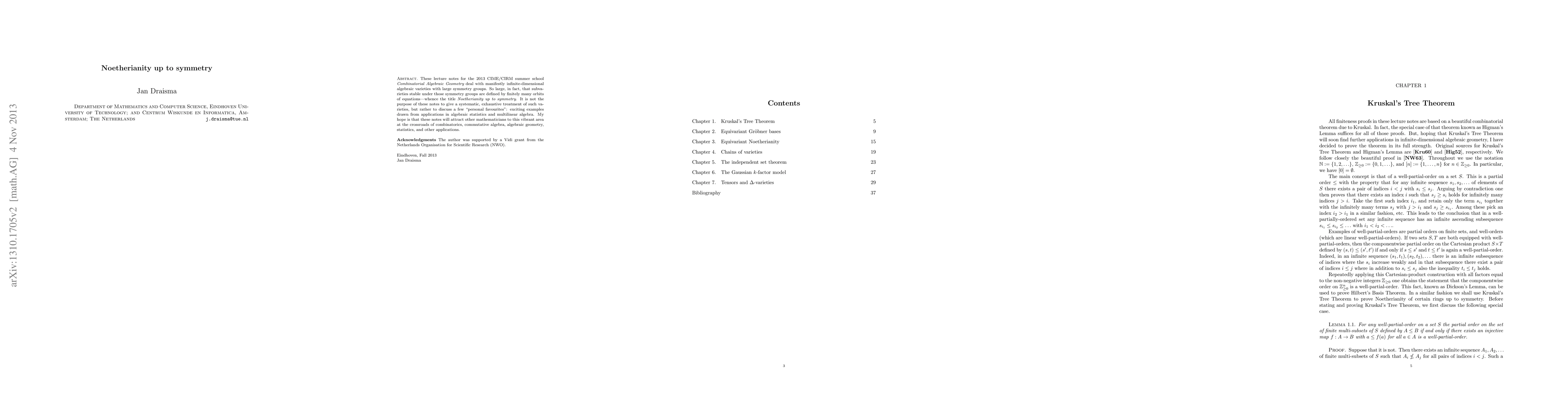 These lecture notes for the 2013 CIME/CIRM summer school Combinatorial Algebraic Geometry deal with manifestly infinite-dimensional algebraic varieties with large symmetry groups. So large, in fact, that subvarieties stable under those symmetry groups are defined by finitely many orbits of equations---whence the title Noetherianity up to symmetry. It is not the purpose of these notes to give a systematic, exhaustive treatment of such varieties, but rather to discuss a few "personal favourites": exciting examples drawn from applications in algebraic statistics and multilinear algebra. My hope is that these notes will attract other mathematicians to this vibrant area at the crossroads of combinatorics, commutative algebra, algebraic geometry, statistics, and other applications.
