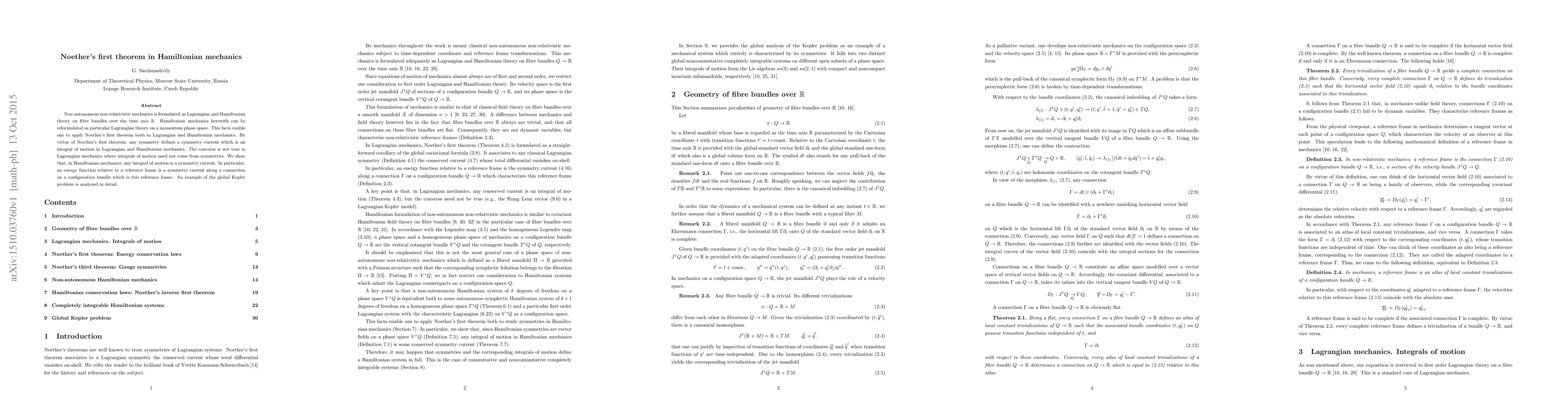 This paper reformulates non-autonomous non-relativistic mechanics using Hamiltonian theory on fibre bundles, enabling the application of Noether's first theorem. It demonstrates that in Hamiltonian mechanics, any integral of motion corresponds to a symmetry current, contrasting with Lagrangian mechanics where not all integrals of motion stem from symmetries. An example of the global Kepler problem is provided for detailed analysis.