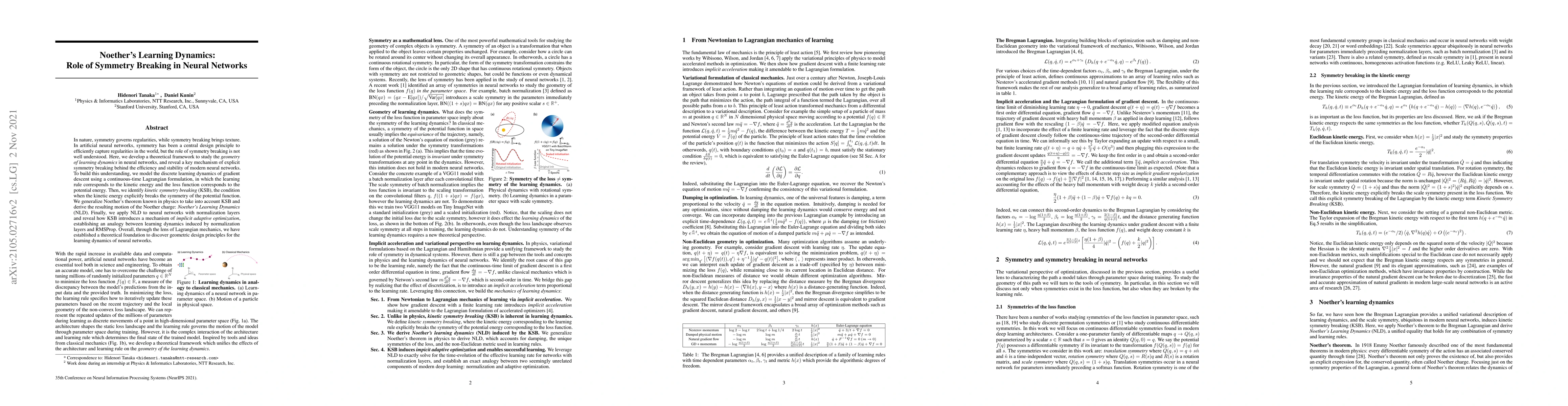 This paper develops a theoretical framework to explore the role of symmetry breaking in neural networks, revealing that "kinetic symmetry breaking" enhances learning efficiency and stability. By applying Lagrangian mechanics, it introduces "Noether's Learning Dynamics" to describe the learning process, showing how normalization layers induce implicit adaptive optimization akin to RMSProp.