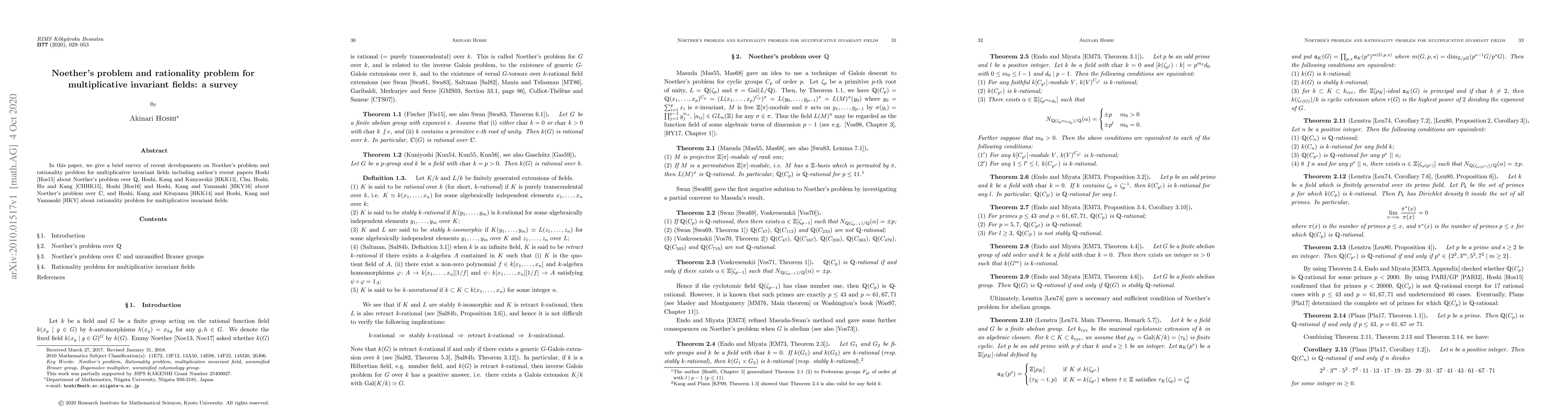 In this paper, we give a brief survey of recent developments on Noether's problem and rationality problem for multiplicative invariant fields including author's recent papers Hoshi [Hos15] about Noether's problem over Q, Hoshi, Kang and Kunyavskii [HKK13], Chu, Hoshi, Hu and Kang [CHHK15], Hoshi [Hos16] and Hoshi, Kang and Yamasaki [HKY16] about Noether's problem over C, and Hoshi, Kang and Kitayama [HKK14] and Hoshi, Kang and Yamasaki [HKY] about rationality problem for multiplicative invariant fields.