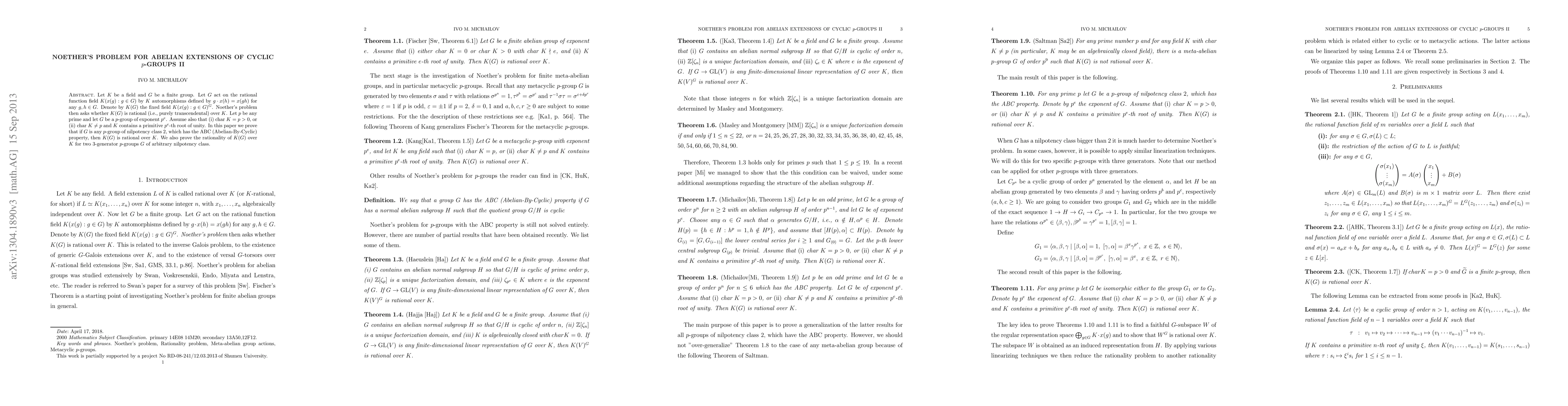 The paper employs group-theoretic methods and linearization techniques to study Noether's problem for abelian extensions of cyclic $p$-groups, specifically focusing on $p$-groups of nilpotency class 2 with the ABC property and two 3-generator $p$-groups of arbitrary nilpotency class.