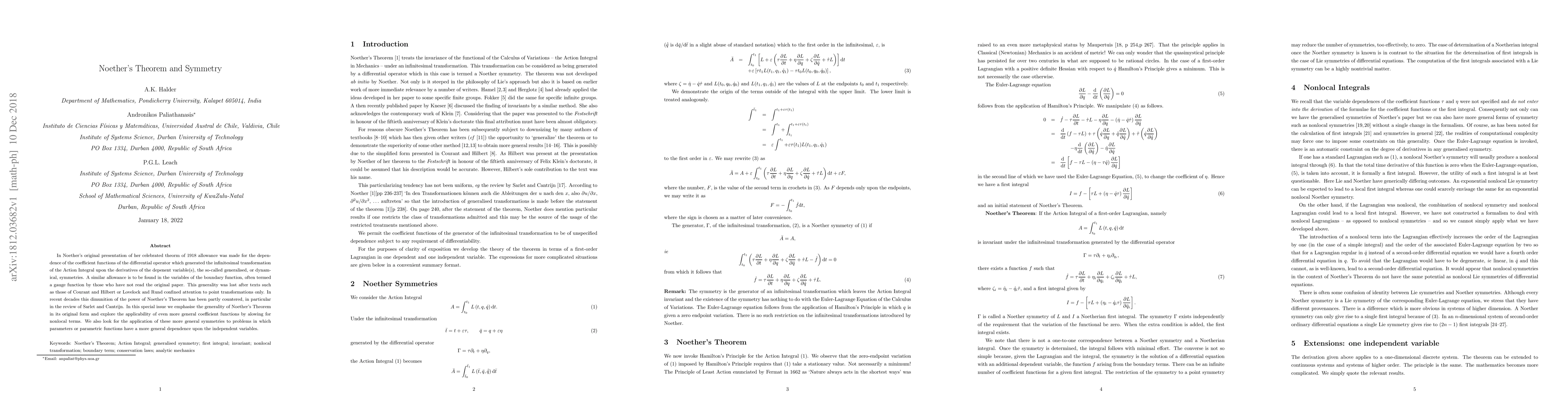 In Noether's original presentation of her celebrated theorm of 1918 allowance was made for the dependence of the coefficient functions of the differential operator which generated the infinitesimal transformation of the Action Integral upon the derivatives of the depenent variable(s), the so-called generalised, or dynamical, symmetries. A similar allowance is to be found in the variables of the boundary function, often termed a gauge function by those who have not read the original paper. This generality was lost after texts such as those of Courant and Hilbert or Lovelock and Rund confined attention to point transformations only. In recent decades this dimunition of the power of Noether's Theorem has been partly countered, in particular in the review of Sarlet and Cantrijn. In this special issue we emphasise the generality of Noether's Theorem in its original form and explore the applicability of even more general coefficient functions by alowing for nonlocal terms. We also look for the application of these more general symmetries to problems in which parameters or parametric functions have a more general dependence upon the independent variables