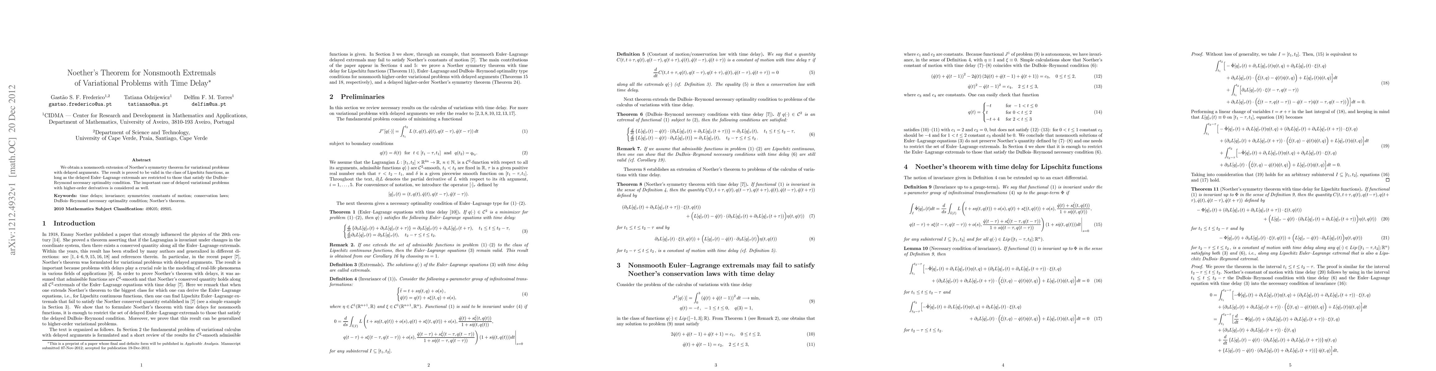 This paper extends Noether's symmetry theorem to nonsmooth extremals in variational problems featuring time delays, proving its validity for Lipschitz functions under the DuBois-Reymond condition, and also addresses higher-order derivatives in delayed variational problems.