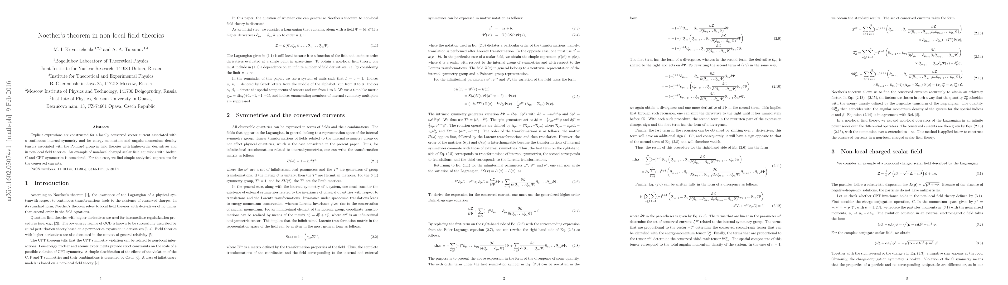 Explicit expressions are constructed for a locally conserved vector current associated with a continuous internal symmetry and for energy-momentum and angular-momentum density tensors associated with the Poincar\'e group in field theories with higher-order derivatives and in non-local field theories. An example of non-local charged scalar field equations with broken C and CPT symmetries is considered. For this case, we find simple analytical expressions for the conserved currents.