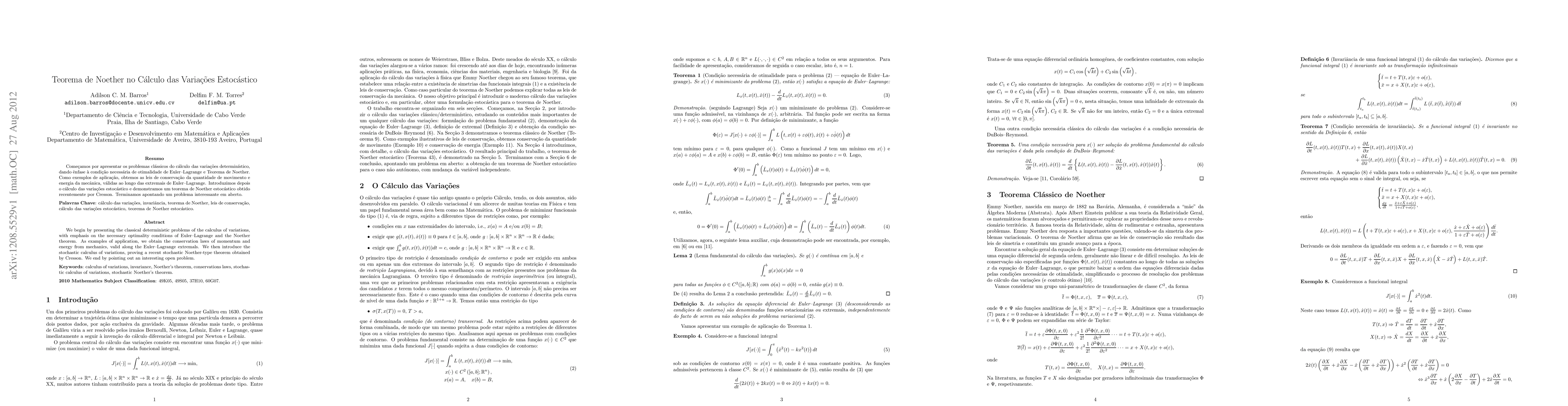 We begin by presenting the classical deterministic problems of the calculus of variations, with emphasis on the necessary optimality conditions of Euler-Lagrange and the Noether theorem. As examples of application, we obtain the conservation laws of momentum and energy from mechanics, valid along the Euler-Lagrange extremals. We then introduce the stochastic calculus of variations, proving a recent stochastic Noether-type theorem obtained by Cresson. We end by pointing out an interesting open problem.