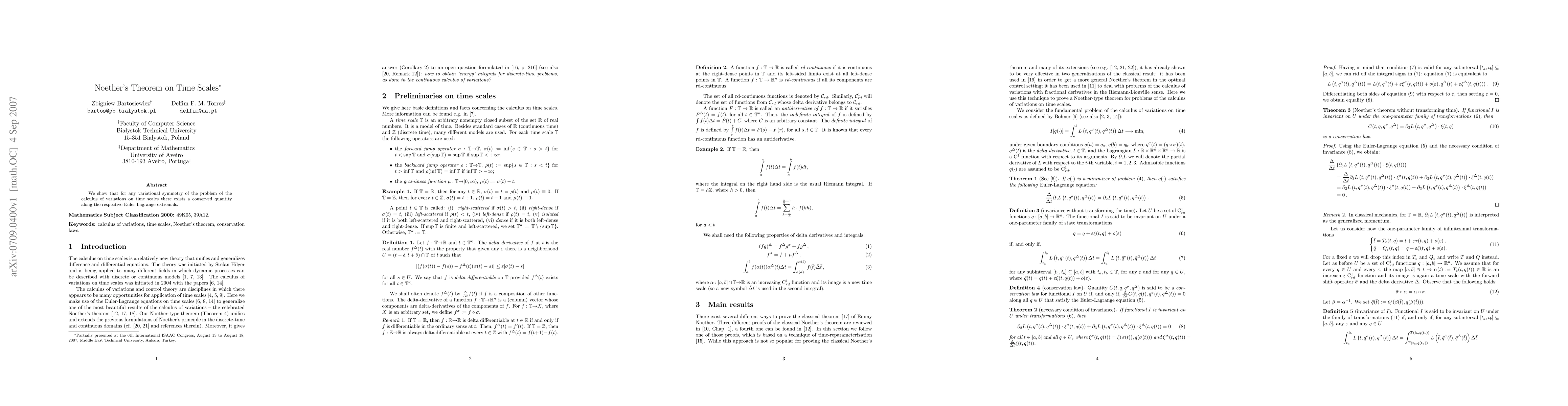 Summary: This paper demonstrates that variational symmetries in the calculus of variations on time scales lead to conserved quantities along Euler-Lagrange extremals, extending Noether's theorem to this generalized setting.