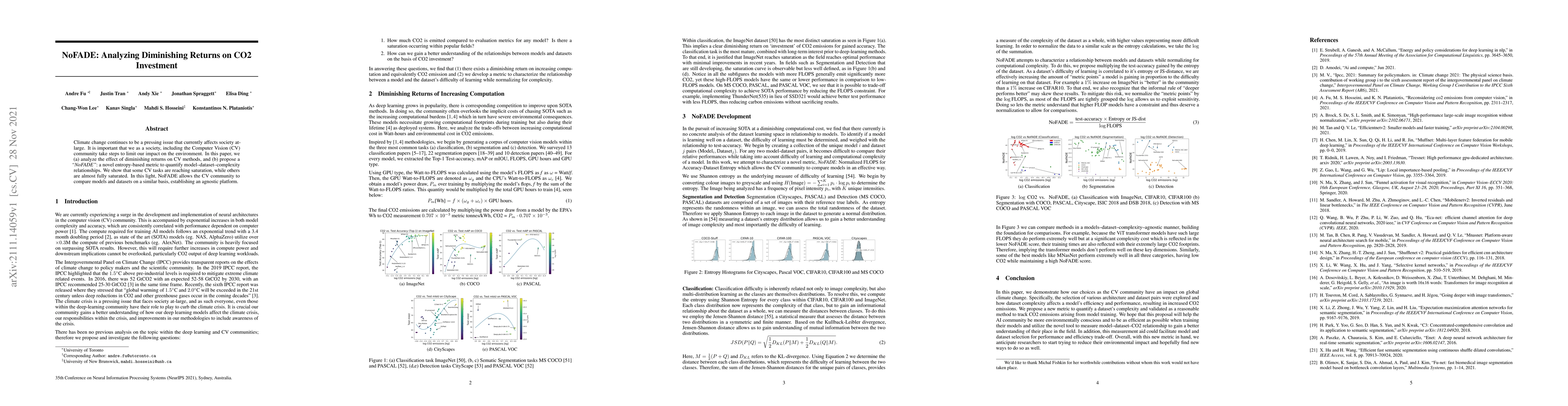 Climate change continues to be a pressing issue that currently affects society at-large. It is important that we as a society, including the Computer Vision (CV) community take steps to limit our impact on the environment. In this paper, we (a) analyze the effect of diminishing returns on CV methods, and (b) propose a \textit{``NoFADE''}: a novel entropy-based metric to quantify model--dataset--complexity relationships. We show that some CV tasks are reaching saturation, while others are almost fully saturated. In this light, NoFADE allows the CV community to compare models and datasets on a similar basis, establishing an agnostic platform.