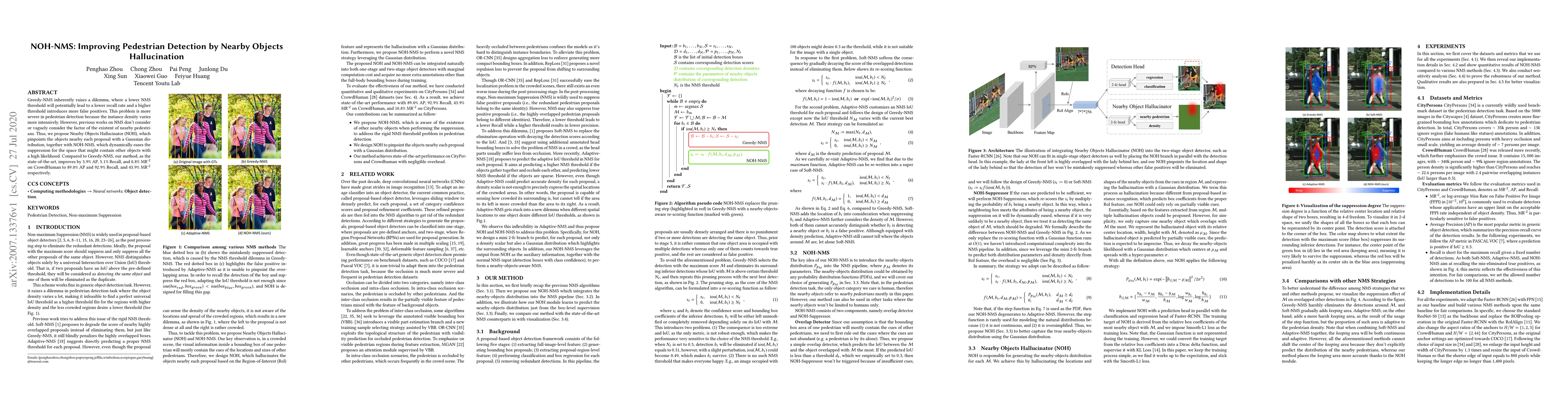 The paper proposes NOH-NMS to improve pedestrian detection by dynamically adjusting Non-Maximum Suppression (NMS) based on the likelihood of nearby objects, addressing the trade-off between recall and false positives. The method achieves a $3.9\%$ improvement in Average Precision, a $5.1\%$ increase in Recall, and a $0.8\%$ reduction in Miss Rate squared on the CrowdHuman dataset.