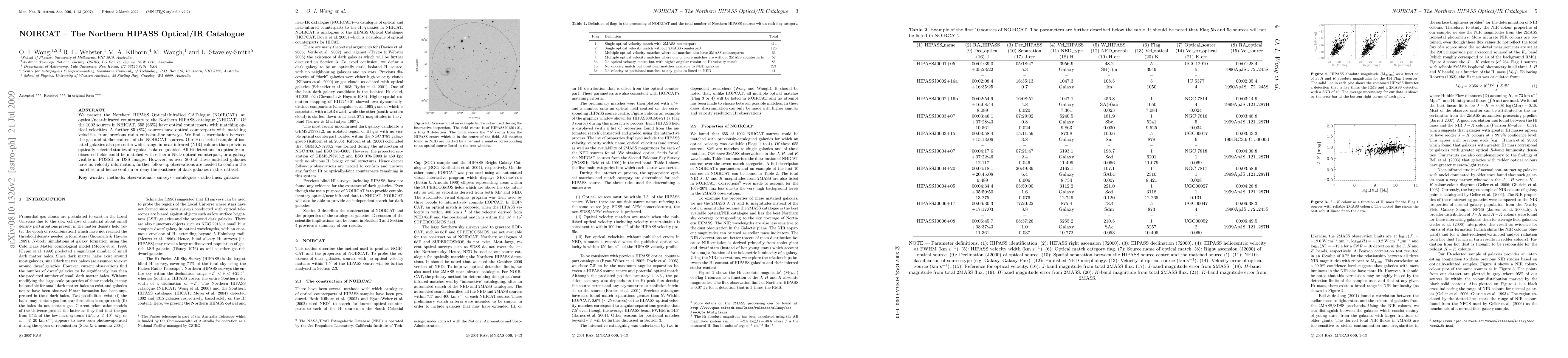 We present the Northern HIPASS Optical/InfraRed CATalogue (NOIRCAT), an optical/near-infrared counterpart to the Northern HIPASS catalogue (NHICAT). Of the 1002 sources in NHICAT, 655 (66%) have optical counterparts with matching optical velocities. A further 85 (8%) sources have optical counterparts with matching velocities from previous radio emission-line surveys. We find a correlation between the gas and stellar content of the NOIRCAT sources. Our HI-selected sample of isolated galaxies also present a wider range in near-infrared (NIR) colours than previous optically-selected studies of regular, isolated galaxies. All HI detections in optically unobscured fields could be matched with either a NED optical counterpart, or a galaxy visible in POSSII or DSS images. However, as over 200 of these matched galaxies have no velocity information, further follow-up observations are needed to confirm the matches, and hence confirm or deny the existence of dark galaxies in this dataset.