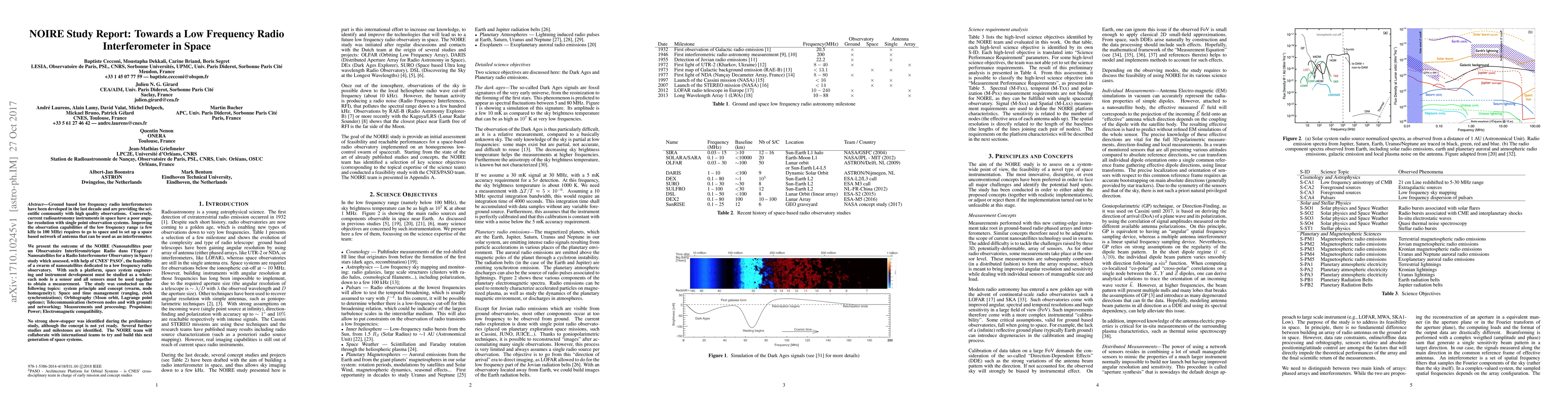 The NOIRE study explores the feasibility of deploying a swarm of nanosatellites for a low-frequency radio interferometer in space, aiming to improve angular resolution and observation capabilities. Preliminary findings indicate no major technical barriers but emphasize the need for further studies and international collaboration.