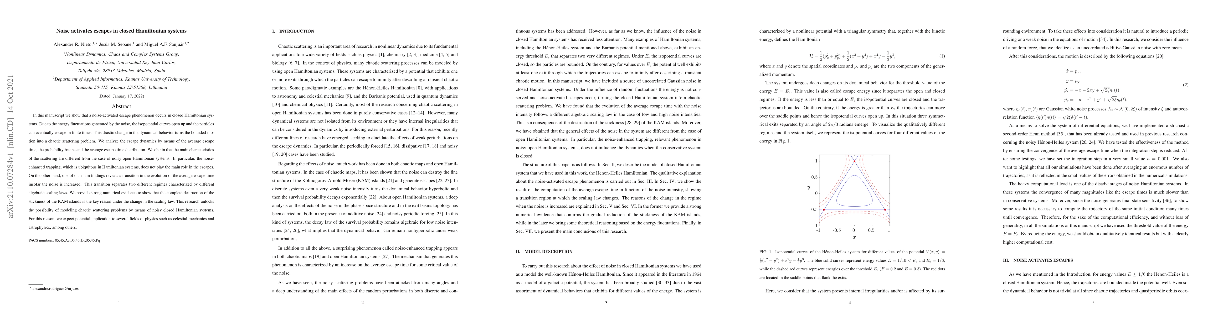 This paper demonstrates that noise can induce escape phenomena in closed Hamiltonian systems, transforming bounded motion into chaotic scattering. The study reveals a transition in escape dynamics characterized by different scaling laws, driven by the destruction of KAM islands' stickiness, with potential applications in celestial mechanics and astrophysics.