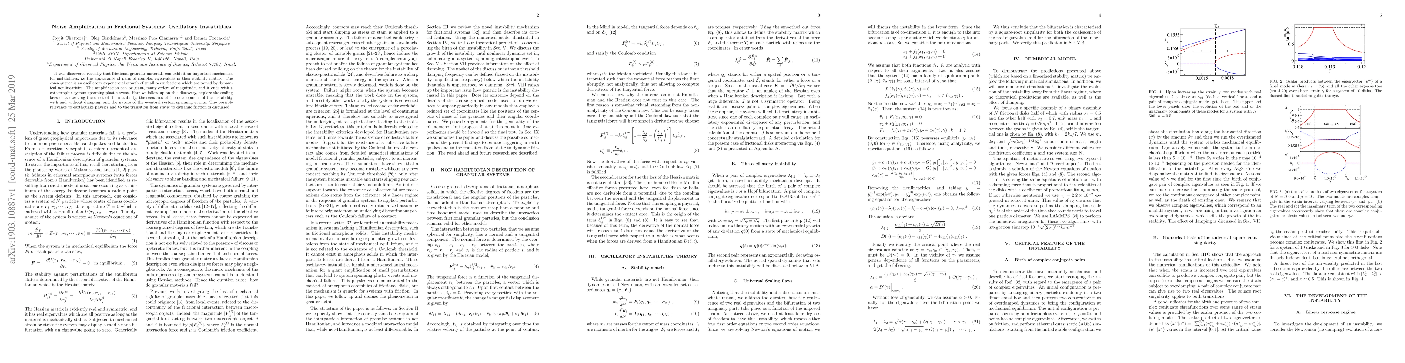 It was discovered recently that frictional granular materials can exhibit an important mechanism for instabilities, i.e the appearance of pairs of complex eigenvalues in their stability matrix. The consequence is an oscillatory exponential growth of small perturbations which are tamed by dynamical nonlinearities. The amplification can be giant, many orders of magnitude, and it ends with a catastrophic system-spanning plastic event. Here we follow up on this discovery, explore the scaling laws characterizing the onset of the instability, the scenarios of the development of the instability with and without damping, and the nature of the eventual system spanning events. The possible relevance to earthquake physics and to the transition from static to dynamic friction is discussed.