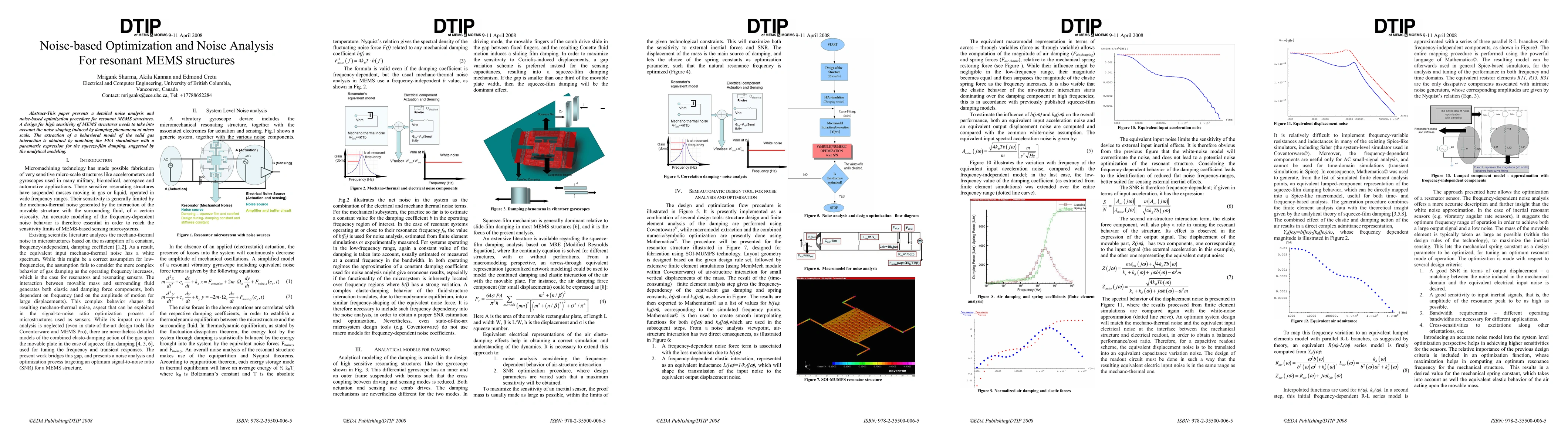 This paper conducts a detailed noise analysis and proposes a noise-based optimization procedure for resonant MEMS structures, addressing the impact of damping phenomena on noise shaping and introducing a semi-automatic method for macromodel extraction and sensor optimization to enhance signal-to-noise ratio.