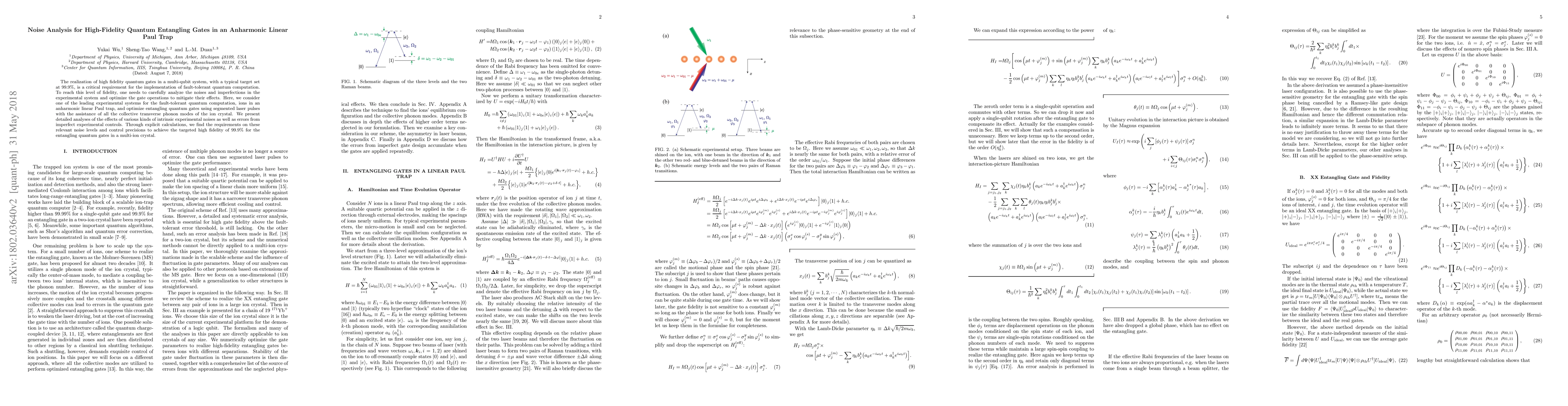 This paper analyzes the intrinsic experimental noises and control errors affecting high-fidelity quantum entangling gates in an anharmonic linear Paul trap, optimizing gate operations with segmented laser pulses. It determines the necessary noise levels and control precisions to achieve a 99.9% fidelity target for multi-ion quantum computations.