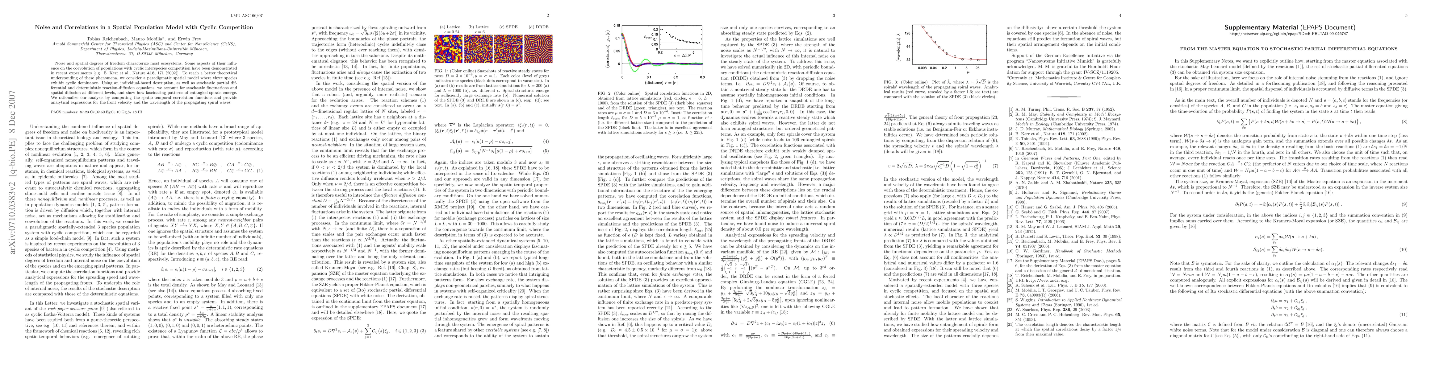 This paper explores the impact of noise and spatial diffusion on the coevolution of three species with cyclic competition using a spatial population model. It reveals intricate patterns of spiral waves and provides analytical expressions for the front velocity and wavelength of these waves through individual-based and stochastic modeling.