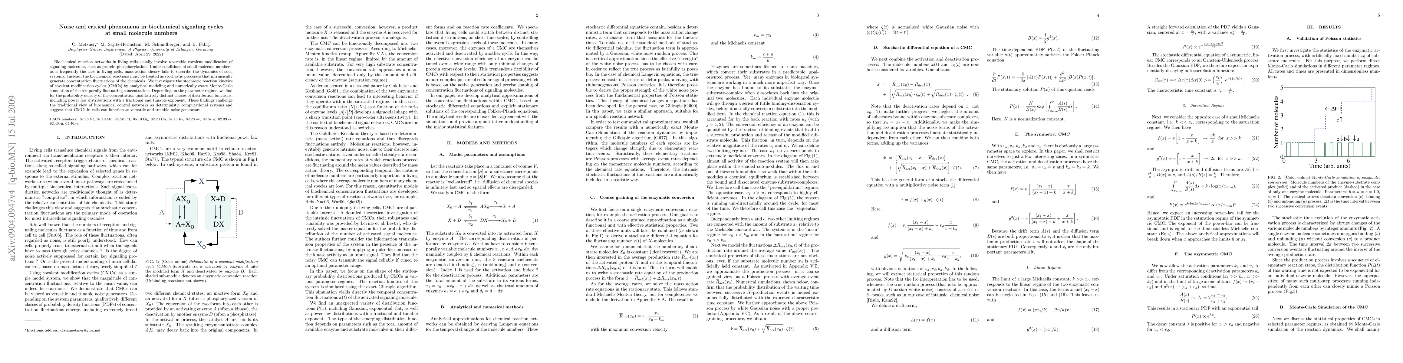 Biochemical reaction networks in living cells usually involve reversible covalent modification of signaling molecules, such as protein phosphorylation. Under conditions of small molecule numbers, as is frequently the case in living cells, mass action theory fails to describe the dynamics of such systems. Instead, the biochemical reactions must be treated as stochastic processes that intrinsically generate concentration fluctuations of the chemicals. We investigate the stochastic reaction kinetics of covalent modification cycles (CMCs) by analytical modeling and numerically exact Monte-Carlo simulation of the temporally fluctuating concentration. Depending on the parameter regime, we find for the probability density of the concentration qualitatively distinct classes of distribution functions, including power law distributions with a fractional and tunable exponent. These findings challenge the traditional view of biochemical control networks as deterministic computational systems and suggest that CMCs in cells can function as versatile and tunable noise generators.