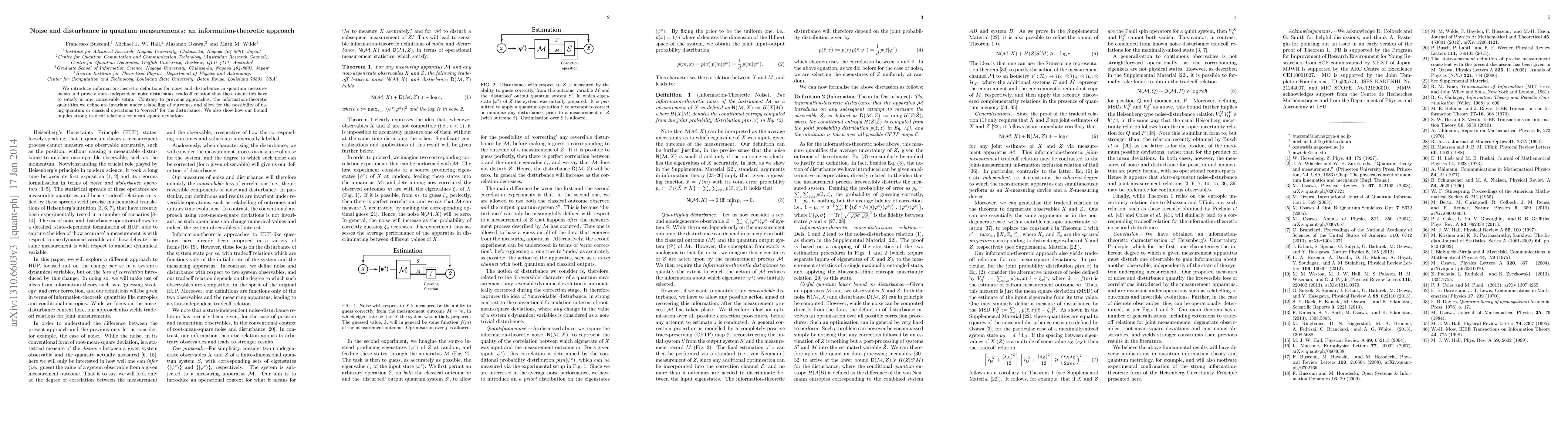 This paper introduces information-theoretic definitions for noise and disturbance in quantum measurements, establishing a state-independent tradeoff relation between them. Unlike previous methods, the defined quantities are invariant under outcome relabelling and allow for corrective measures using quantum or classical operations.