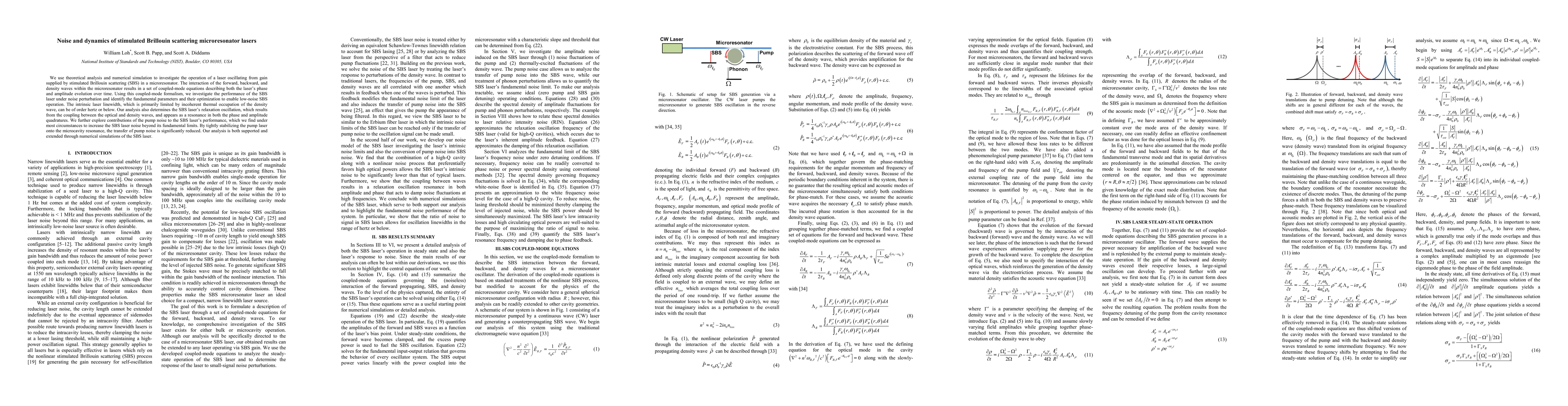 We use theoretical analysis and numerical simulation to investigate the operation of a laser oscillating from gain supplied by stimulated Brillouin scattering (SBS) in a microresonator. The interaction of the forward, backward, and density waves within the microresonator results in a set of coupled-mode equations describing both the laser's phase and amplitude evolution over time. Using this coupled-mode formalism, we investigate the performance of the SBS laser under noise perturbation and identify the fundamental parameters and their optimization to enable low-noise SBS operation. The intrinsic laser linewidth, which is primarily limited by incoherent thermal occupation of the density wave, can be of order hertz or below. Our analysis also determines the SBS laser's relaxation oscillation, which results from the coupling between the optical and density waves, and appears as a resonance in both the phase and amplitude quadratures. We further explore contributions of the pump noise to the SBS laser's performance, which we find under most circumstances to increase the SBS laser noise beyond its fundamental limits. By tightly stabilizing the pump laser onto the microcavity resonance, the transfer of pump noise is significantly reduced. Our analysis is both supported and extended through numerical simulations of the SBS laser.