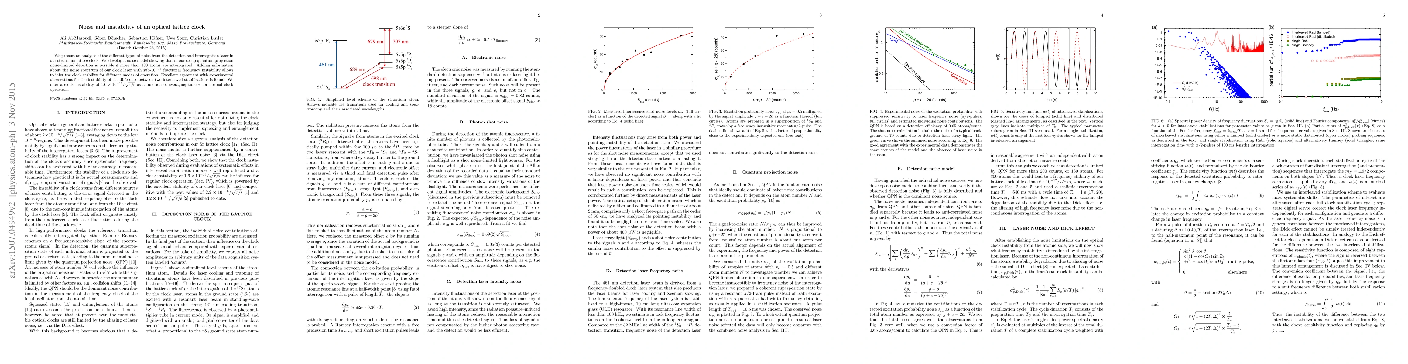 We present an analysis of the different types of noise from the detection and interrogation laser in our strontium lattice clock. We develop a noise model showing that in our setup quantum projection noise--limited detection is possible if more than 130~atoms are interrogated. Adding information about the noise spectrum of our clock laser with sub-$10^{-16}$ fractional frequency instability allows to infer the clock stability for different modes of operation. Excellent agreement with experimental observations for the instability of the difference between two interleaved stabilizations is found. We infer a clock instability of $1.6 \times 10^{-16}/\sqrt{\tau / \mathrm{s}}$ as a function of averaging time $\tau$ for normal clock operation.