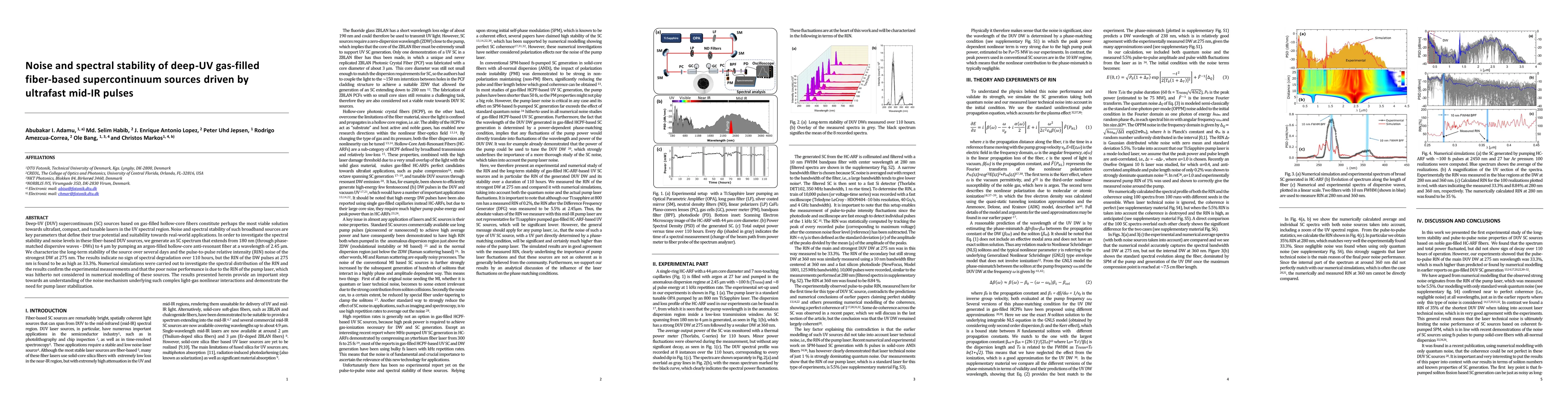 This paper investigates the noise and spectral stability of deep-UV supercontinuum sources generated in gas-filled hollow-core fibers pumped by ultrafast mid-IR pulses. The study finds long-term spectral stability over 110 hours but high relative intensity noise (RIN) of 33.3% in the strongest dispersive wave at 275 nm, attributed to the pump laser's RIN, highlighting the need for its stabilization.