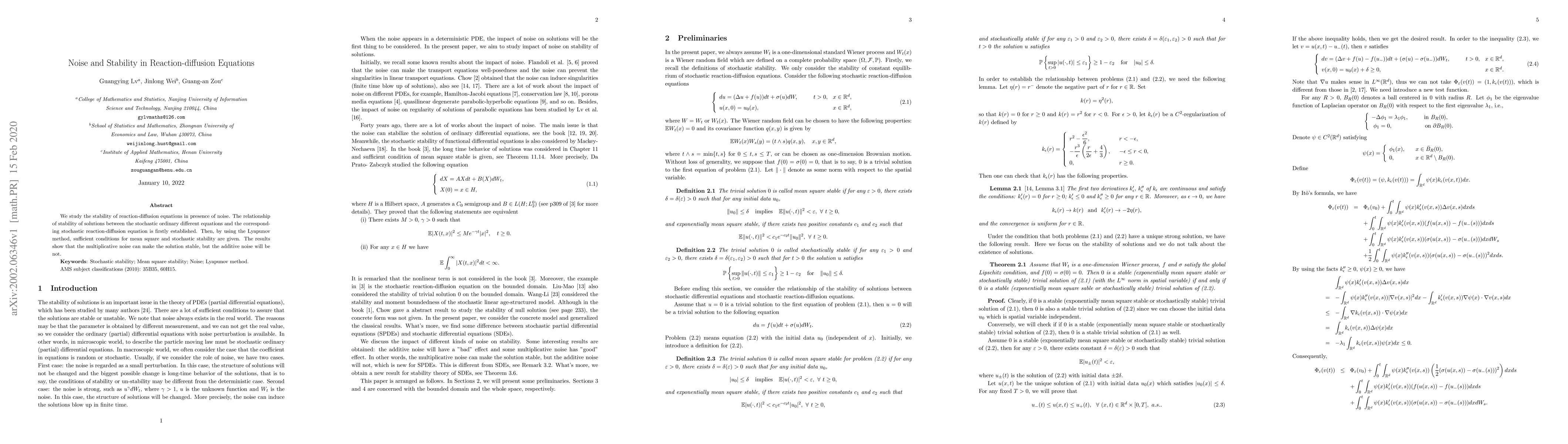 This paper investigates the stability of reaction-diffusion equations under noise, establishing a relationship between stochastic ordinary differential equations and their stochastic counterparts. It provides sufficient conditions for mean square and stochastic stability using the Lyapunov method, revealing that multiplicative noise can stabilize solutions while additive noise does not.