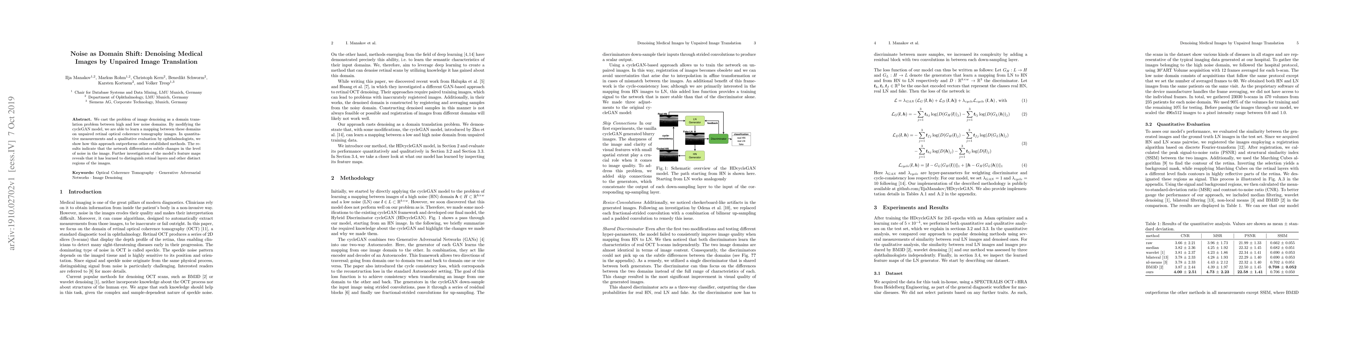 We cast the problem of image denoising as a domain translation problem between high and low noise domains. By modifying the cycleGAN model, we are able to learn a mapping between these domains on unpaired retinal optical coherence tomography images. In quantitative measurements and a qualitative evaluation by ophthalmologists, we show how this approach outperforms other established methods. The results indicate that the network differentiates subtle changes in the level of noise in the image. Further investigation of the model's feature maps reveals that it has learned to distinguish retinal layers and other distinct regions of the images.