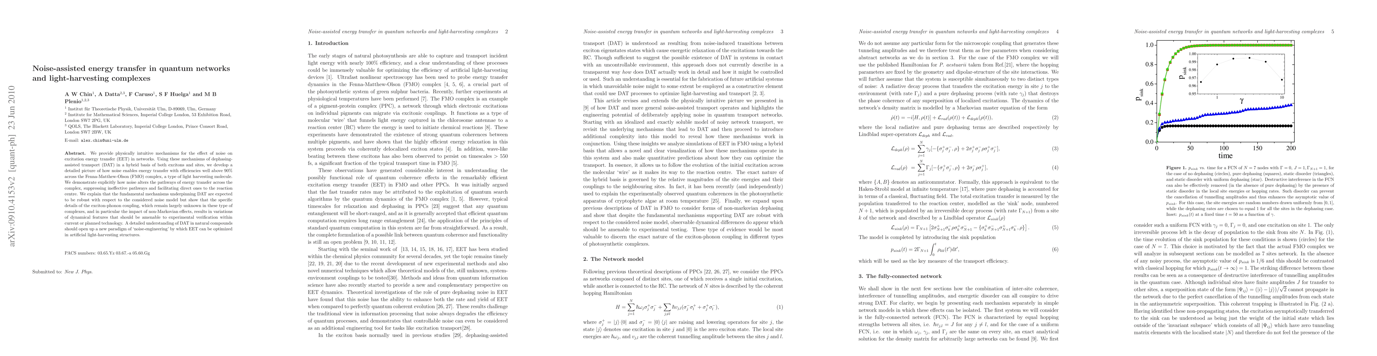 This paper explores how noise enhances excitation energy transfer in quantum networks, particularly in the FMO complex, through dephasing-assisted transport mechanisms. It demonstrates that noise can optimize energy transfer efficiency by suppressing ineffective pathways and promoting direct routes to the reaction center, potentially enabling a new approach to optimizing artificial light-harvesting systems.