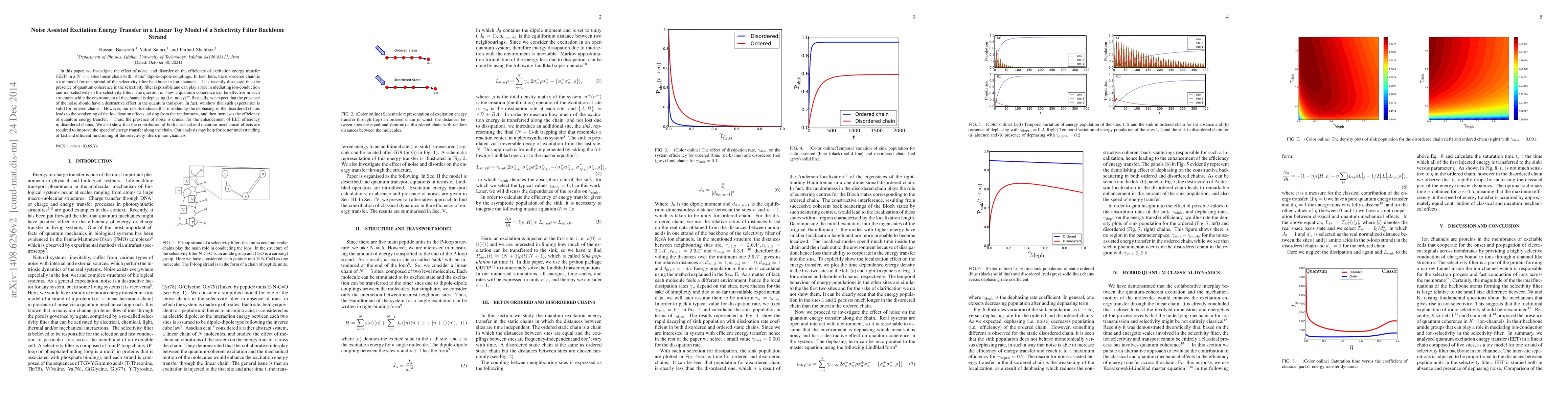 In this paper, we investigate the effect of noise and disorder on the efficiency of excitation energy transfer (EET) in a $N=5$ sites linear chain with "static" dipole-dipole couplings. In fact, here, the disordered chain is a toy model for one strand of the selectivity filter backbone in ion channels. It is recently discussed that the presence of quantum coherence in the selectivity filter is possible and can play a role in mediating ion-conduction and ion-selectivity in the selectivity filter. The question is "how a quantum coherence can be effective in such structures while the environment of the channel is dephasing (i.e. noisy)?" Basically, we expect that the presence of the noise should have a destructive effect in the quantum transport. In fact, we show that such expectation is valid for ordered chains. However, our results indicate that introducing the dephasing in the disordered chains leads to the weakening of the localization effects, arising from the randomness, and then increases the efficiency of quantum energy transfer. Thus, the presence of noise is crucial for the enhancement of EET efficiency in disordered chains. We also show that the contribution of both classical and quantum mechanical effects are required to improve the speed of energy transfer along the chain. Our analysis may help for better understanding of fast and efficient functioning of the selectivity filters in ion channels.