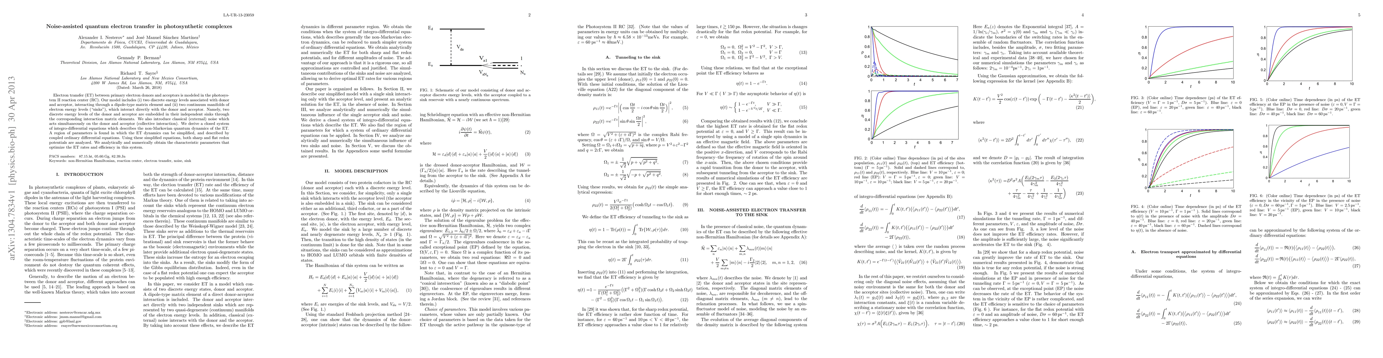 This paper models electron transfer in photosystem II's reaction center, incorporating discrete energy levels and continuum electron sinks, and classical noise. It derives integro-differential equations for non-Markovian quantum dynamics, simplifying them to ordinary differential equations to optimize electron transfer rates and efficiency.