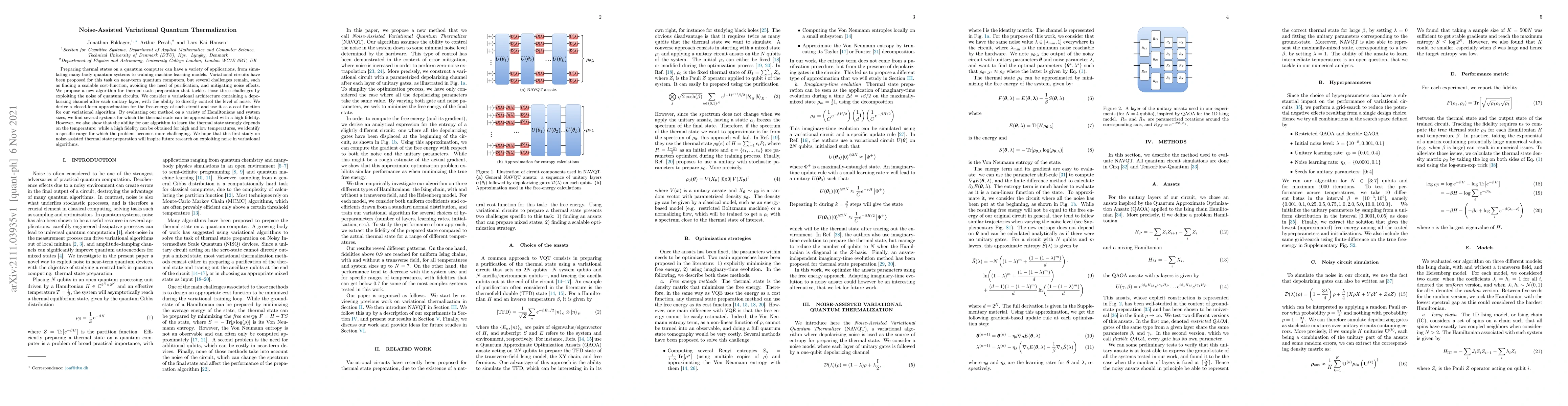 This paper proposes a novel variational algorithm for preparing thermal states on quantum computers by leveraging circuit noise, addressing scalability, purification, and noise mitigation challenges. The method introduces a depolarizing channel after each unitary layer, enabling direct noise control and a high-fidelity approximation for various Hamiltonians, though with notable difficulty at intermediate temperatures.