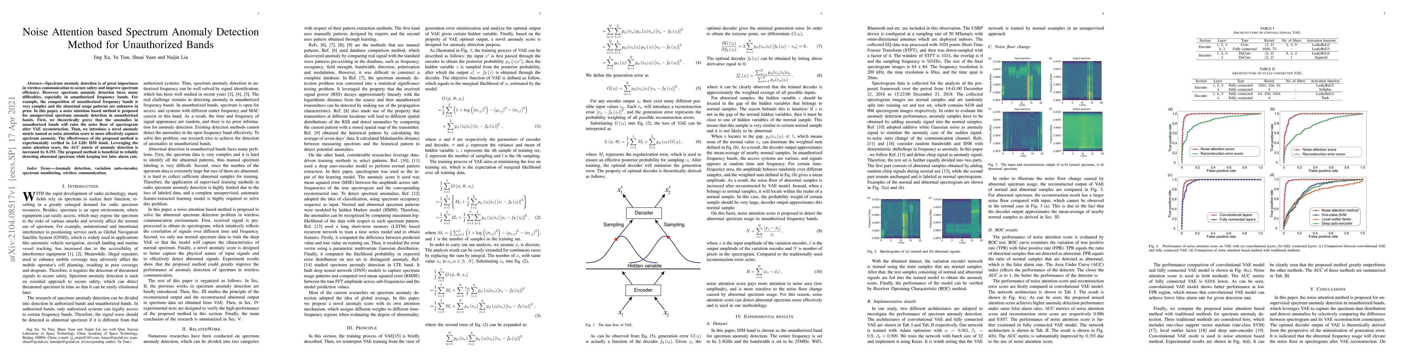 This paper proposes a noise attention method for unsupervised spectrum anomaly detection in unauthorized frequency bands. It leverages a theoretical proof that anomalies raise the noise floor in spectrograms post VAE reconstruction, introducing a noise attention score metric to enhance detection. Experimental results show a 0.193 increase in AUC metric, demonstrating effective anomaly detection with low false alarm rates.