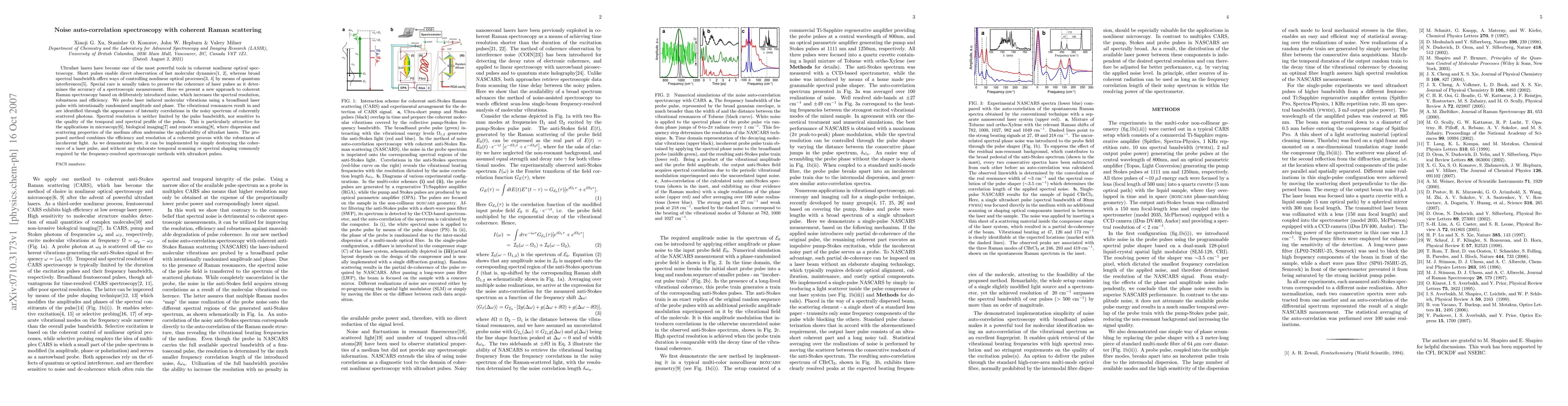 This paper introduces a novel noise auto-correlation spectroscopy technique using coherent Raman scattering, which enhances spectral resolution and robustness by deliberately introducing noise into laser pulses. The method effectively overcomes limitations of pulse bandwidth and coherence quality, making it suitable for microscopy, biological imaging, and remote sensing.