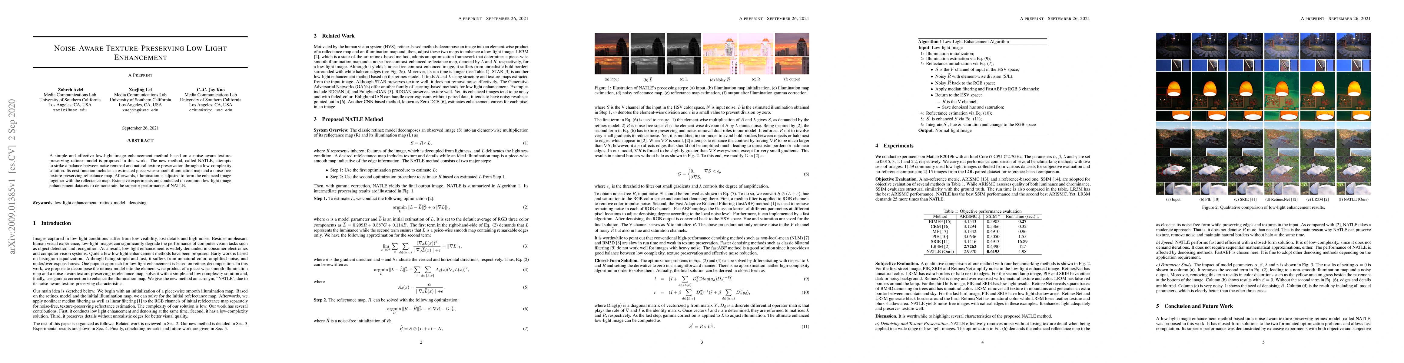 This paper proposes NATLE, a low-complexity low-light image enhancement method based on a noise-aware texture-preserving retinex model, balancing noise removal and natural texture preservation. Extensive experiments show NATLE's superior performance on common datasets.