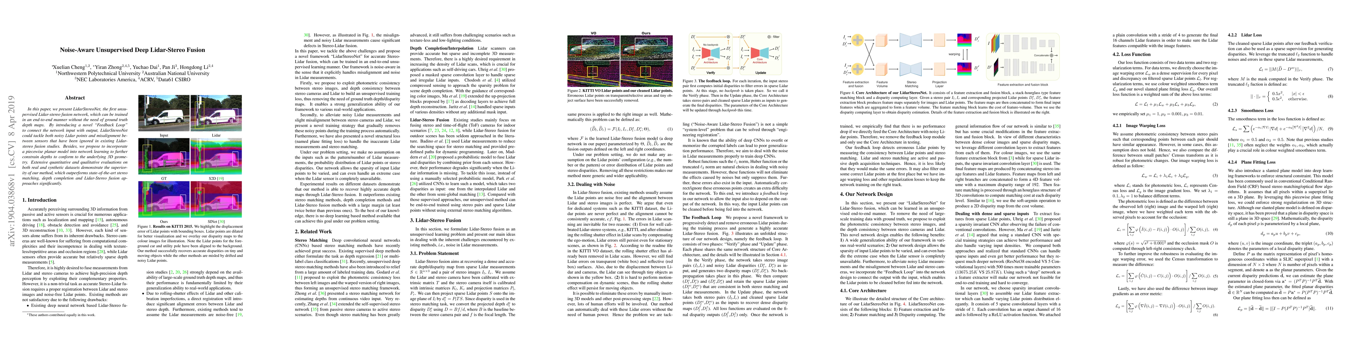 LidarStereoNet is an unsupervised Lidar-stereo fusion network that trains end-to-end without ground truth depth maps, addressing noisy Lidar points and sensor misalignment. It incorporates a "Feedback Loop" and a piecewise planar model, outperforming existing methods in depth completion and fusion tasks.