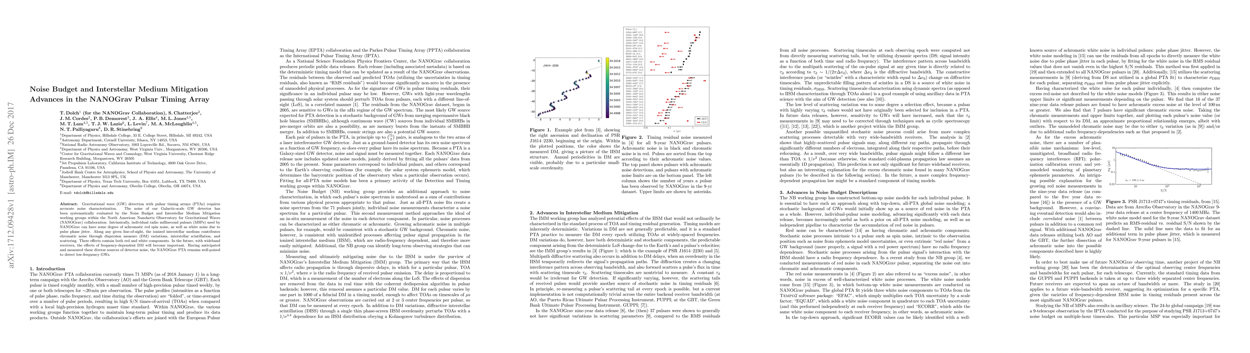 The NANOGrav collaboration has systematically evaluated noise sources in their Galactic-scale gravitational wave detector, including pulsar spin noise, interstellar medium effects, and future frequency-dependent dispersion measure variations, positioning the Pulsar Timing Array to detect low-frequency gravitational waves.
