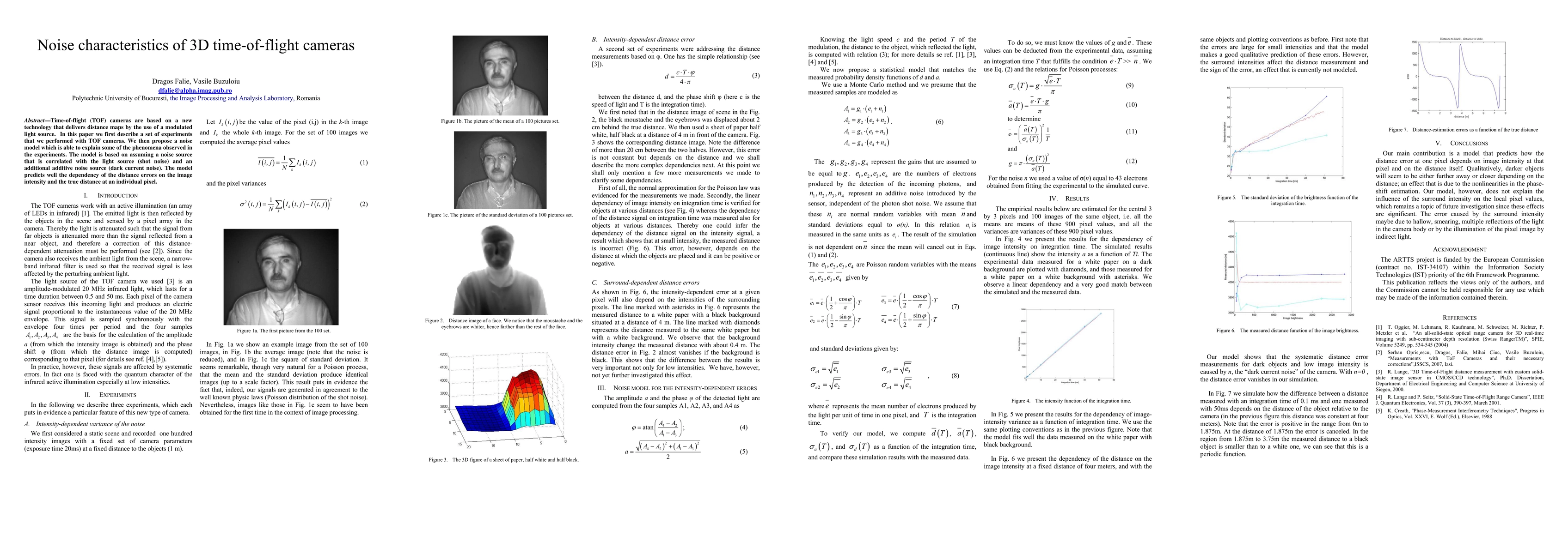 This paper investigates the noise characteristics of 3D time-of-flight cameras, proposing a noise model that accounts for shot noise correlated with the light source and dark current noise. The model accurately predicts the relationship between distance errors, image intensity, and true distance at individual pixels.