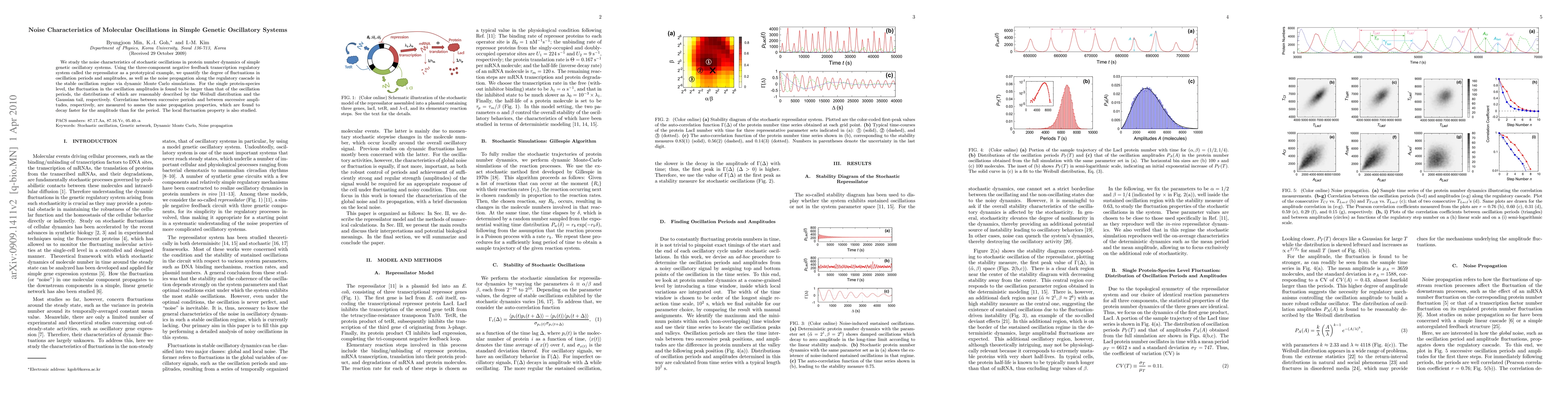 We study the noise characteristics of stochastic oscillations in protein number dynamics of simple genetic oscillatory systems. Using the three-component negative feedback transcription regulatory system called the repressilator as a prototypical example, we quantify the degree of fluctuations in oscillation periods and amplitudes, as well as the noise propagation along the regulatory cascade in the stable oscillation regime via dynamic Monte Carlo simulations. For the single protein-species level, the fluctuation in the oscillation amplitudes is found to be larger than that of the oscillation periods, the distributions of which are reasonably described by the Weibull distribution and the Gaussian tail, respectively. Correlations between successive periods and between successive amplitudes, respectively, are measured to assess the noise propagation properties, which are found to decay faster for the amplitude than for the period. The local fluctuation property is also studied.