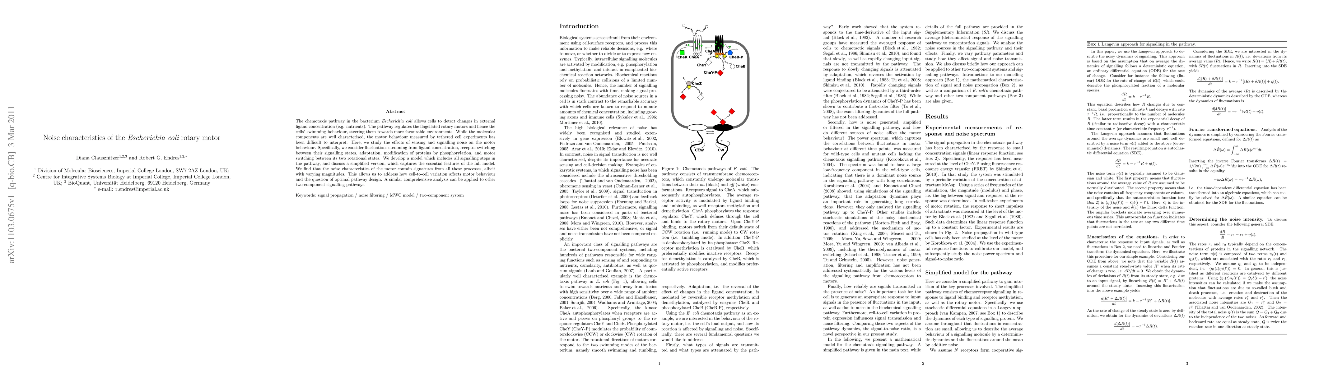This paper investigates the noise characteristics of Escherichia coli's rotary motor, revealing how various biological processes contribute to motor fluctuations. The study develops a comprehensive model to analyze the effects of ligand concentration, receptor switching, and other factors, finding that motor noise contains signatures from all these processes, aiding in understanding cell-to-cell variation and pathway design.