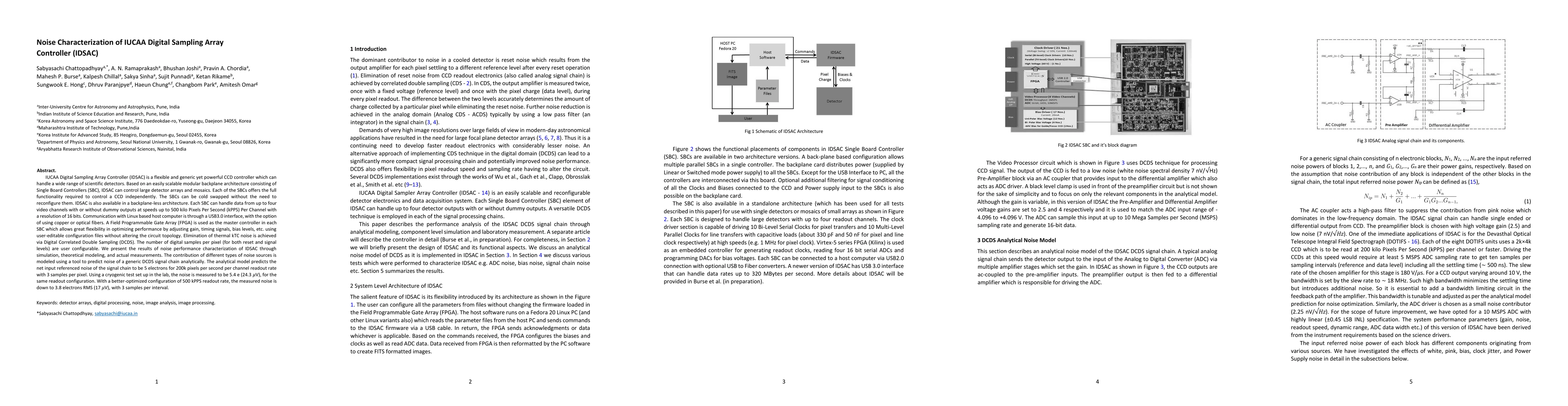 IUCAA Digital Sampling Array Controller (IDSAC) is a flexible and generic yet powerful CCD controller which can handle a wide range of scientific detectors. Based on an easily scalable modular backplane architecture consisting of Single Board Controllers (SBC), IDSAC can control large detector arrays and mosaics. Each of the SBCs offers the full functionality required to control a CCD independently. The SBCs can be cold swapped without the need to reconfigure them. Each SBC can handle data from up to four video channels with or without dummy outputs at speeds up to 500 kilo Pixels Per Second (kPPS) Per Channel with a resolution of 16 bits. Communication with Linux based host computer is through a USB3.0 interface, with the option of using copper or optical fibers. A Field Programmable Gate Array (FPGA) is used as the master controller in each SBC which allows great flexibility in optimizing performance by adjusting gain, timing signals, bias levels, etc. using user-editable configuration files without altering the circuit topology. Elimination of thermal kTC noise is achieved via Digital Correlated Double Sampling (DCDS). We present the results of noise performance characterization of IDSAC through simulation, theoretical modeling, and actual measurements. The contribution of different types of noise sources is modeled using a tool to predict noise of a generic DCDS signal chain analytically. The analytical model predicts the net input referenced noise of the signal chain to be 5 electrons for 200k pixels per second per channel readout rate with 3 samples per pixel. Using a cryogenic test set up in the lab, the noise is measured to be 5.4 e (24.3 \muV), for the same readout configuration.