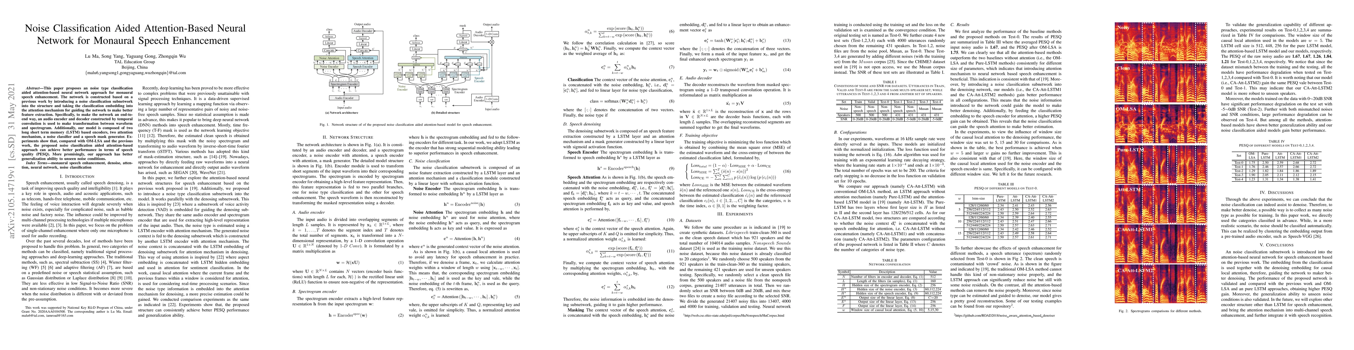 This paper introduces a noise classification aided attention-based neural network for monaural speech enhancement, combining a noise classifier with an attention mechanism to enhance feature extraction. The model achieves superior speech quality and better generalization to unseen noise conditions compared to previous methods.