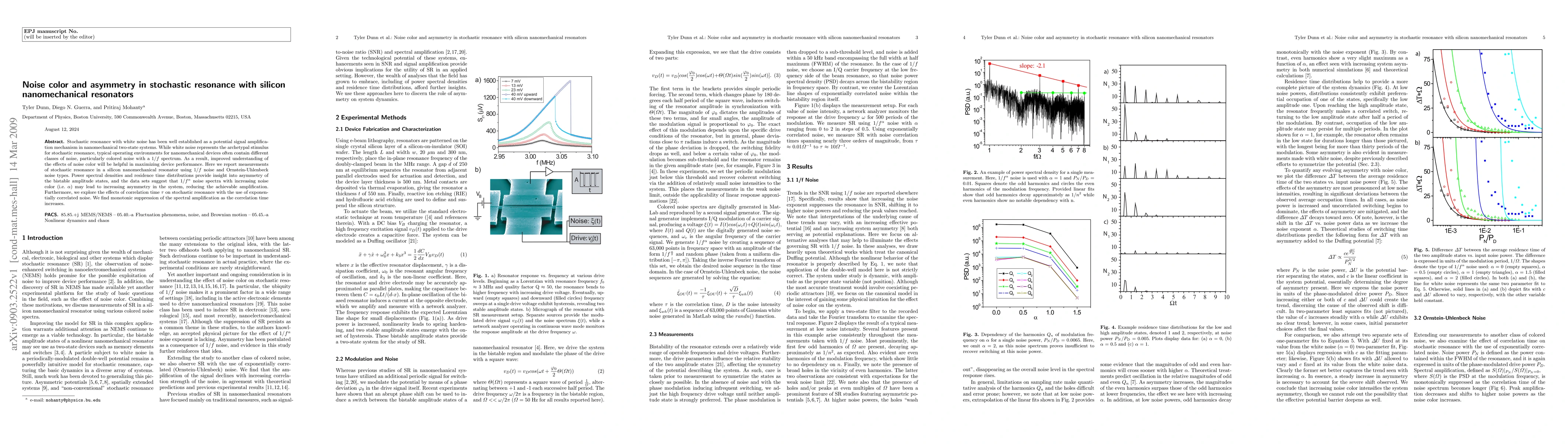 This paper investigates stochastic resonance in silicon nanomechanical resonators under different noise types, including 1/f and Ornstein-Uhlenbeck noise. It finds that increasing noise color (1/f^alpha) leads to greater asymmetry in the system, reducing amplification, while longer correlation times suppress spectral amplification.