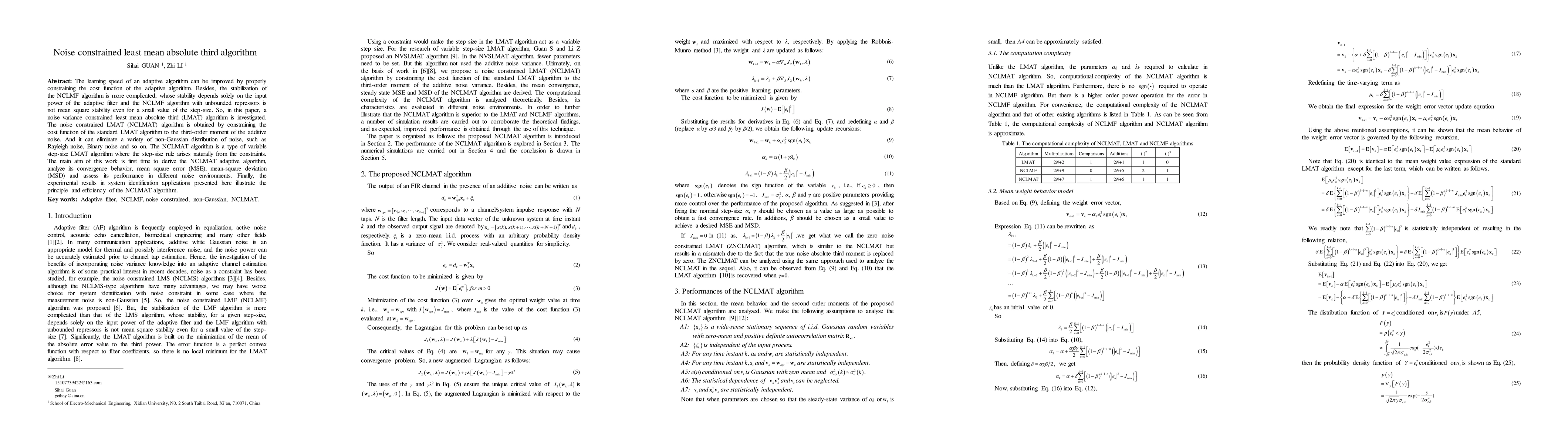 The learning speed of an adaptive algorithm can be improved by properly constraining the cost function of the adaptive algorithm. Besides, the stabilization of the NCLMF algorithm is more complicated, whose stability depends solely on the input power of the adaptive filter and the NCLMF algorithm with unbounded repressors is not mean square stability even for a small value of the step-size. So, in this paper, a noise variance constrained least mean absolute third (LMAT) algorithm is investigated. The noise constrained LMAT (NCLMAT) algorithm is obtained by constraining the cost function of the standard LMAT algorithm to the third-order moment of the additive noise. And it can eliminate a variety of non-Gaussian distribution of noise, such as Rayleigh noise, Binary noise and so on. The NCLMAT algorithm is a type of variable step-size LMAT algorithm where the step-size rule arises naturally from the constraints. The main aim of this work is first time to derive the NCLMAT adaptive algorithm, analyze its convergence behavior, mean square error (MSE), mean-square deviation (MSD) and assess its performance in different noise environments. Finally, the experimental results in system identification applications presented here illustrate the principle and efficiency of the NCLMAT algorithm.
